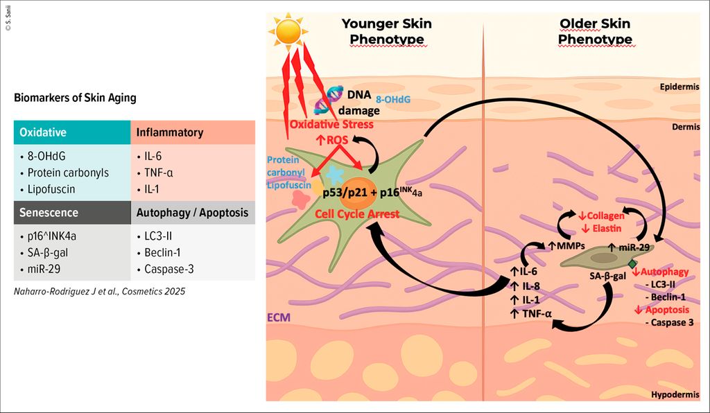 Fig. 1: Le phénotype sécrétoire associé à la sénescence (SASP) dans le vieillissement cutané. Le stress oxydatif induit par les UV et les ROS provoque des dommages à l’ADN (8-OHdG, protéines carbonylées, lipofuscine) et active les voies p53/p21 et p16INK4a, entraînant l’arrêt du cycle cellulaire des fibroblastes. Ces cellules sénescentes acquièrent un SASP caractérisé par la sécrétion accrue de cytokines pro-inflammatoires (IL-6, IL-1, TNF-α) et de métalloprotéinases matricielles (MMP), responsables de la dégradation du collagène et de l’élastine. Parallèlement, une diminution de miR-29 et une altération des voies d’autophagie/apoptose (LC3-II, Beclin-1, Caspase-3) contribuent à la persistance des cellules sénescentes et à la déstructuration du derme, marquant la transition d’un phénotype cutané jeune vers un phénotype vieilli (adapté de Naharro-Rodriguez J et al.2025)10