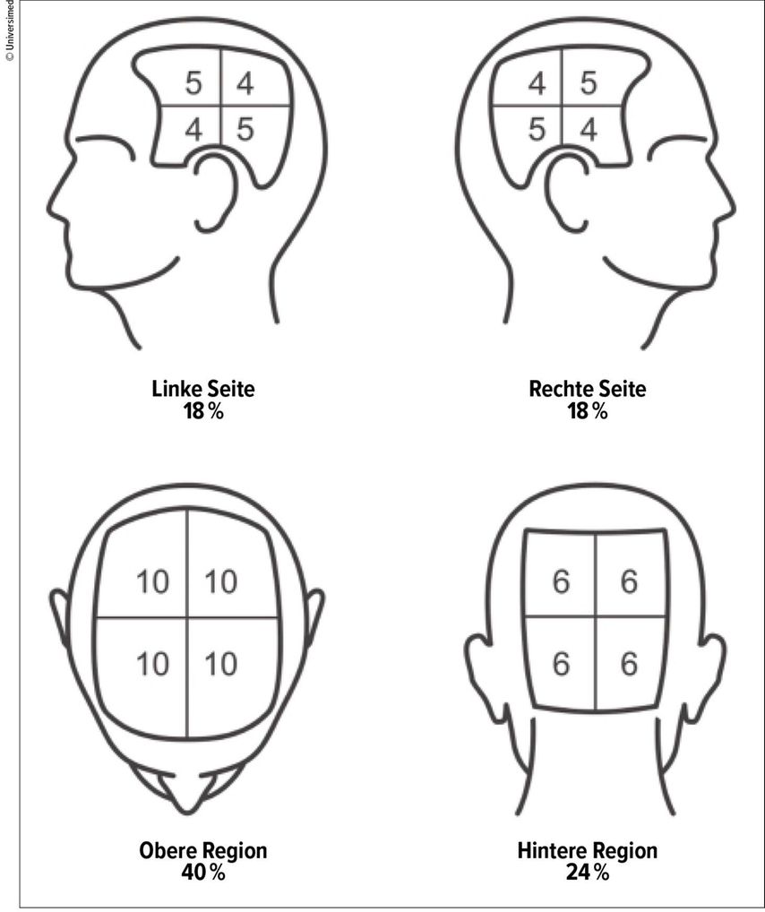 Um das Ausmass des Haarverlustes am Kopf zu objektivieren – was später für die Therapiewahl, insbesondere in Bezug auf die neuen Medikamente, wichtig ist –, berechnet man den «Severity of Alopecia Areata Tool»(SALT)-Score. Ein Score von 0 bedeutet kein Haarverlust, 100 steht für komplette Glatze. Um den Score zu berechnen, teilt man den Kopf in vier Regionen ein und diese wiederum in Quadranten. Die obere Region sind 4x10 Punkte (40), die posteriore 4x6 Punkte (24) und rechts und links jeweils 2x18 Punkte (36) (Abb.2).10 Man schätzt die Fläche der Herde ein, vergibt entsprechend Punkte und zählt sie zusammen. Als milde Alopezie gilt ein Haarverlust bis 20%, was einem Score von 20 entspricht, als moderate ein Verlust von 21–49%, und ein Score von 50 oder mehr bedeutet eine schwere Alopezie. Eine milde Alopezie gilt als «schlimmer», wenn Augenbrauen oder Wimpern merklich ausfallen, wenn eine mindestens 6-monatige Therapie nicht hilft, wenn der Zupftest auf einen diffusen oder multifokalen Befall hinweist und wenn die Krankheit die psychosoziale Funktion des Patienten negativ beeinflusst.11