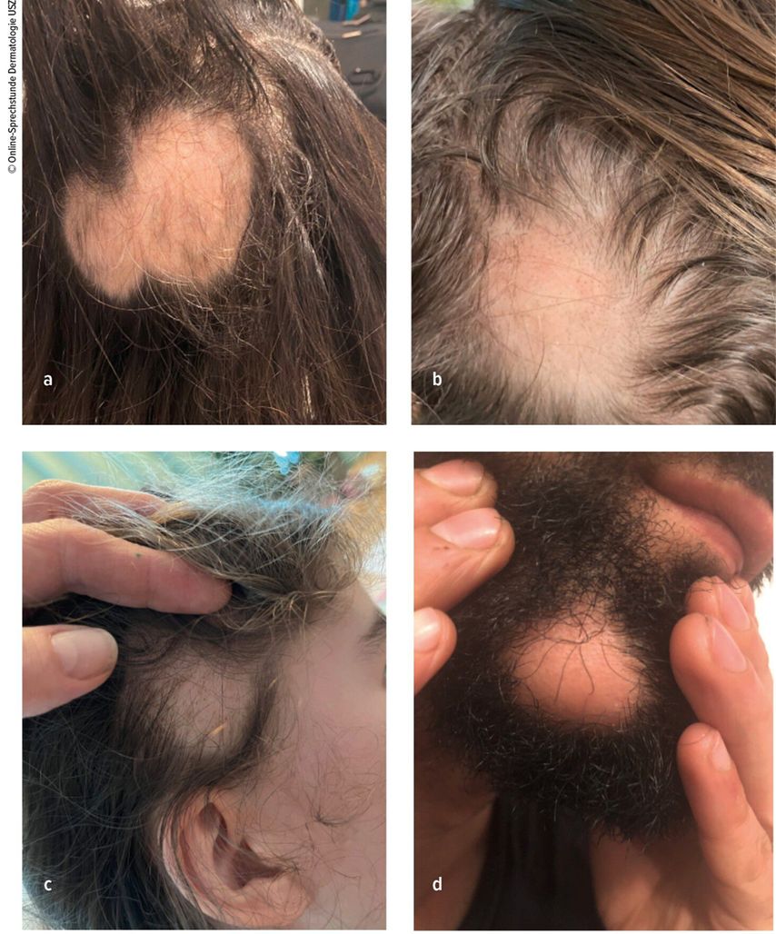 Die Diagnose wird klinisch gestellt. Typisch sind scharf begrenzte, rund-ovale, kahle Stellen ohne Narben. Zum Teil sind einzelne Resthaare oder depigmentierte Haare zu erkennen (Abb.1). Hilfreich für die Diagnose ist die Dermatoskopie. Damit lassen sich vernarbende Haarkrankheiten abgrenzen – etwa durch Verbrennungen oder Infektionen – und die Aktivität der Alopezie kann so eingeschätzt werden. Klassischerweise erkennt man mit dem Dermatoskop «Ausrufezeichen-Haare», also solche, die oben dicker und unten, zur Kopfhaut hin, immer dünner werden. Die Haare sehen so aus, weil der Haarfollikel über die Zeit immer mehr zerstört wird. Zu sehen sind häufig auch abgebrochene Haare, dünne, unpigmentierte Flaumhaare oder winzige Punkte. Runde, gelbe oder rosa-gelbe kreisförmige Punkte («yellow dots») entsprechen den erweiterten, aber intakten Öffnungen der Haarfollikel, die mit Talg oder Resten von Keratinozyten gefüllt sind. Schwarze Punkte, «black dots», sind die Reste von Haarschäften, die vor allem bei Patienten mit dunklen Haaren und heller Haut zu sehen sind.