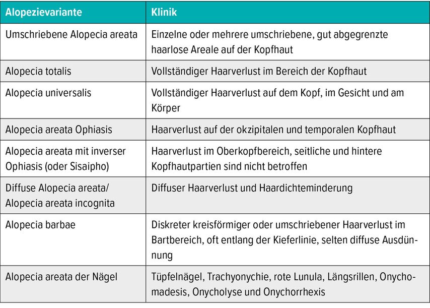 1 Rakowska A et al.: Diagnostic and therapeutic recommendations of the Polish Dermatological Society. Part 1. Diagnosis and severity assessment. Dermatol Rev 2023; 110(2): 89-100 2 Lintzeri DA et al.: Alopecia areata - Aktuelles Verständnis und Management. J Dtsch Dermatol Ges 2022; 20(1): 59-93 3 Chelidze K, Lipner SR: Nail changes in alopecia areata: an update and review. Int J Dermatol 2018; 57(7): 776-83 4 Vañó-Galván S et al.: Alopecia areata totalis and universalis: a multicenter review of 132 patients in Spain. J Eur Acad Dermatol Venereol 2017; 31(3): 550-6 5 De Waard-van der Spek FB et al.: Juvenile versus maturity-onset alopecia areata--a comparative retrospective clinical study. Clin Exp Dermatol 1989; 14(6): 429-33 6 Ucak H et al.: Prognostic factors that affect the response to topical treatment in patchy alopecia areata. J Eur Acad Dermatol Venereol 2014; 28(1): 34-40 7 Tosti A et al.: Alopecia areata: a long term follow-up study of 191 patients. J Am Acad Dermatol 2006; 55(3): 438-41 8 Jang YH et al.: Long-Term Prognosis of Alopecia Areata in Children and Adolescents. Ann Dermatol 2019; 31(2): 231-4 9 Muntyanu A et al.: The burden of alopecia areata: a scoping review focusing on quality of life, mental health and work productivity. J Eur Acad Dermatol Venereol 2023; 37: 1490-520 10 Müller Ramos P et al.: II consensus of the Brazilian Society of Dermatology for the treatment of alopecia areata. An Bras Dermatol 2025; 100(2): 328-41 11 King BA et al.: Development of the alopecia areata scale for clinical use: results of an academic-industry collaborative effort. J Am Acad Dermatol 2022; 86(2): 359-64 12 MacLean KJ, Tidman MJ: Alopecia areata: more than skin deep. Practitioner 2013; 257(1764): 29-32 13 Harries MJ et al.: British Association of Dermatologists living guideline for managing people with alopecia areata 2024. Br J Dermatol 2025; 192(2): 190-205 14 Rudnicka L et al.: European expert consensus statement on the systemic treatment of alopecia areata. J Eur Acad Dermatol Venereol 2024; 38(4): 687-94 15 Rastaghi F et al.: The efficacy and adverse effects of corticosteroid pulse therapy in alopecia areata: a review article. Dermatol Pract Concept 2023; 13(4): e2023255 16 Fukumoto T et al.: Treatments for alopecia areata: a systematic review and network meta-analysis. Dermatol Ther 2021; 34(3): e14916 17 King B et al.: Two phase 3 trials of baricitinib for alopecia areata. N Engl J Med 2022; 386(18): 1687-99 18 King B et al.: Efficacy and safety of ritlecitinib in adults and adolescents with alopecia areata: a randomised, double-blind, multicentre, phase 2b-3 trial. Lancet 2023; 401(10387): 1518-29 19 Bundesinstitut für Arzneimittel und Medizinprodukte: Rote-Hand-Brief zu Januskinase-Inhibitoren: Aktualisierte Empfehlungen zur Minimierung der Risiken. https://www.bfarm.de/SharedDocs/Risikoinformationen/Pharmakovigilanz/DE/RHB/2023/rhb-janus-kinase.html (zuletzt aufgerufen am 2.9.2025) 20 Ingrassia JP et al.: Cardiovascular and venous thromboembolic risk with JAK inhibitors in immune-mediated inflammatory skin diseases: a systematic review and meta-analysis. JAMA Dermatol 2024; 160(1): 28-36 21 King B et al.: Safety of baricitinib in adults with severe alopecia areata from two phase III trials over a median of 2.3 years and up to 4 years of treatment. Am J Clin Dermatol 2025; 26(4): 611-22 22 King B et al.: Safety and efficacy of ritlecitinib and brepocitinib in alopecia areata: results from the crossover open-label extension of the ALLEGRO phase 2a trial. JID Innov. 2022; 2(6): 100156 23 Guttman-Yassky E et al.: Ritlecitinib and brepocitinib demonstrate significant improvement in scalp alopecia areata biomarkers. J Allergy Clin Immunol 2022; 149(4): 1318-28