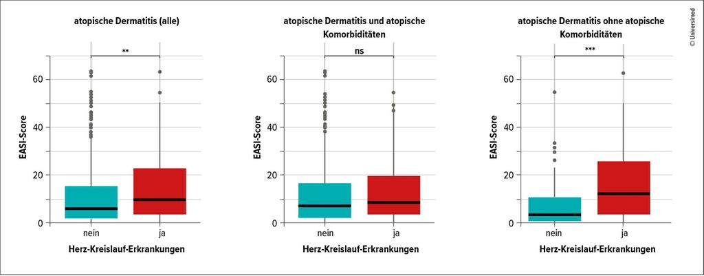 Die Liste der Begleitkrankheiten ist lang: Neben Asthma, Rhinitis und Nahrungsmittelallergien leiden Patienten mit AD häufiger unter Infektionen mit Viren, Bakterien oder Pilzen, die durch Sepsis oder Endokarditis auch lebensbedrohlich sein können. Weiter treten Schlafstörungen sowie psychiatrische Krankheiten wie Depressionen, Angststörungen, Aufmerksamkeitsdefizit/Hyperaktivitäts-Syndrom und Autismus-Spektrum-Störungen auf.17 «Das breite Spektrum der Komorbiditäten zeigt, dass AD eine systemische Krankheit mit zum Teil weitreichenden Folgen sein kann», so Schmid-Grendelmeier. Widersprüchliche Studien gab es bisher dazu, ob AD auch mit einem erhöhten Risiko für Herz-Kreislauf-Erkrankungen einhergeht. Dass der Zusammenhang komplexer ist als gedacht, fand jüngst ein Forscherteam, an dem auch Schmid-Grendelmeier beteiligt war, aus Zürich, Davos und Augsburg in einer Studie mit 677 AD-Patienten und 79 Kontrollpatienten heraus.18 Insgesamt zeigte sich keine Korrelation zwischen AD und Herz-Kreislauf-Erkrankungen. Aber bei Patienten mit AD ohne atopische Komorbiditäten ging eine erhöhte Krankheitsaktivität mit einem erhöhten Risiko für Herz-Kreislauf-Erkrankungen einher (Abb.3). «Die Schwere der AD scheint die Wahrscheinlichkeit für Herz-Kreislauf-Schäden zu beeinflussen, aber nur bei Patienten mit «reiner» AD, also ohne atopische Komorbiditäten», so das Fazit von Schmid-Grendelmeier. Welche Mechanismen dahinterstecken, versuche das Team gerade herauszufinden. «Es scheint an einer Zunahme gewisser Zytokine zu liegen.» Welche Konsequenzen das für die Praxis habe, sei noch nicht klar. «Möglicherweise müssen wir Patienten mit reiner AD häufiger auf kardiovaskuläre Komplikationen screenen.»