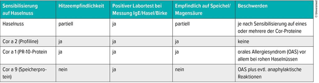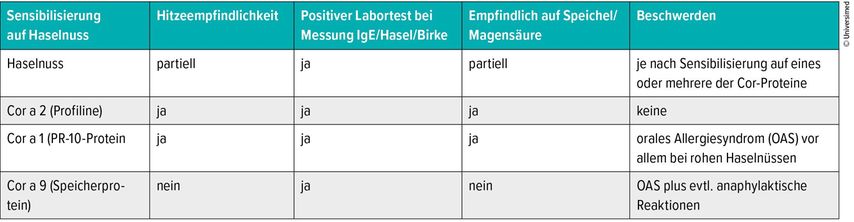 Tab. 1: Beispiel einer Sensibilisierung auf Haselnuss: Mit einer gezielten IgE-Antikörper-Bestimmung gegen Allergene kann ermittelt werden, ob und welche Nahrungsmittel vermieden werden sollen (nach P. Schmid-Grendelmeier)