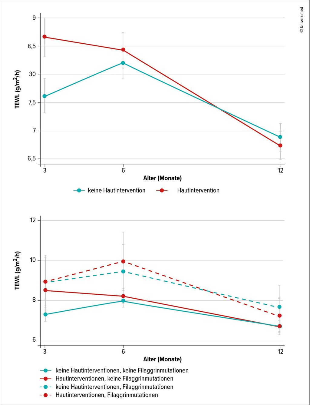 Abb. 1 und 2: Transepidermaler Wasserverlust (TEWL) in g/m2/h (95%CI) bei 1683 Säuglingen mit und ohne Mutationen im Filaggringen, jeweils mit und ohne Intervention an der Haut (Ölbäder) (modifiziert nach Rehbinder EM et al. 2024)1