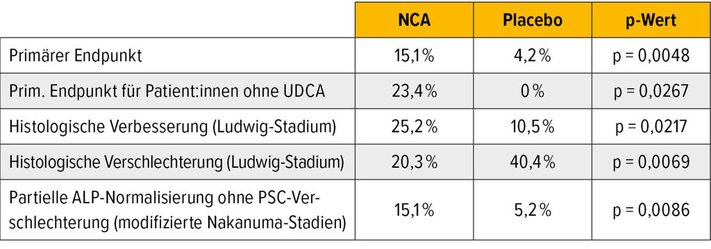 Zur primär sklerosierenden Cholangitis (PSC), für deren Behandlung es bislang keine etablierte medikamentöse Therapie gibt, präsentierte Trauner beim EASL die Ergebnisse der Phase-III-Studie NUC-5 mit Norucholsäure (NCA), einem semisynthetischen Gallensäurederivat.6 301 Patient:innen mit PSC und erhöhter AP (≥1,5-mal «upper limit of normal»; ULN) erhielten in dieser Studie entweder 1500mg NCA oder Placebo einmal täglich p.o. für insgesamt 192 Wochen. In Hinblick auf den primären Endpunkt (AP <1,5-malULN, keine histologische Verschlechterung anhand der Klassifikation nach Ludwig vs. Baseline) zeigte sich bei der Datenanalyse nach 96 Behandlungswochen eine signifikante Überlegenheit von NCA gegenüber Placebo bei gleichzeitig hervorragendem Sicherheitsprofil (Tab.1). Nach 96 Wochen erreichten 15,1% der mit NCA behandelten Patient:innen den primären Endpunkt gegenüber 4,2% unter Placebo (p=0,0048) in der «Intention to treat»-Analyse, in der Patient:innen ohne Follow-up-Leberbiopsie als Therapieversager klassifiziert wurden. Wurden nur Patient:innen ohne fehlende Biopsien/Follow-up-Daten berücksichtigt, lag die Ansprechrate bei 21,7% (gegenüber 5,7% unter Placebo). Interessanterweise wurde eine höhere Ansprechrate auf NCA auch bei Patient:innen ohne begleitende UDCA-Therapie beobachtet (Tab.1). Bei 25,2% in der NCA-Gruppe verbesserte sich die Fibrose um mindestens ein Ludwig-Stadium verglichen mit 10,5% unter Placebo (p=0,0217). Eine Verschlechterung um mindestens ein Ludwig-Stadium trat bei 20,3% der NCA-Gruppe vs. 40,4% unter Placebo auf (p=0,0069). Aufgrund dieser Daten wurde bereits die Zulassung von NCA für die Therapie der PSC beantragt. Weitere Ergebnisse sind nach Abschluss der gesamten 192 Wochen der NUC-5-Studie zu erwarten. Trauner: «Neben der Verbesserung der Patientenversorgung liefert diese Studie auch neue Erkenntnisse, die uns helfen, die Krankheit selbst besser zu verstehen.»