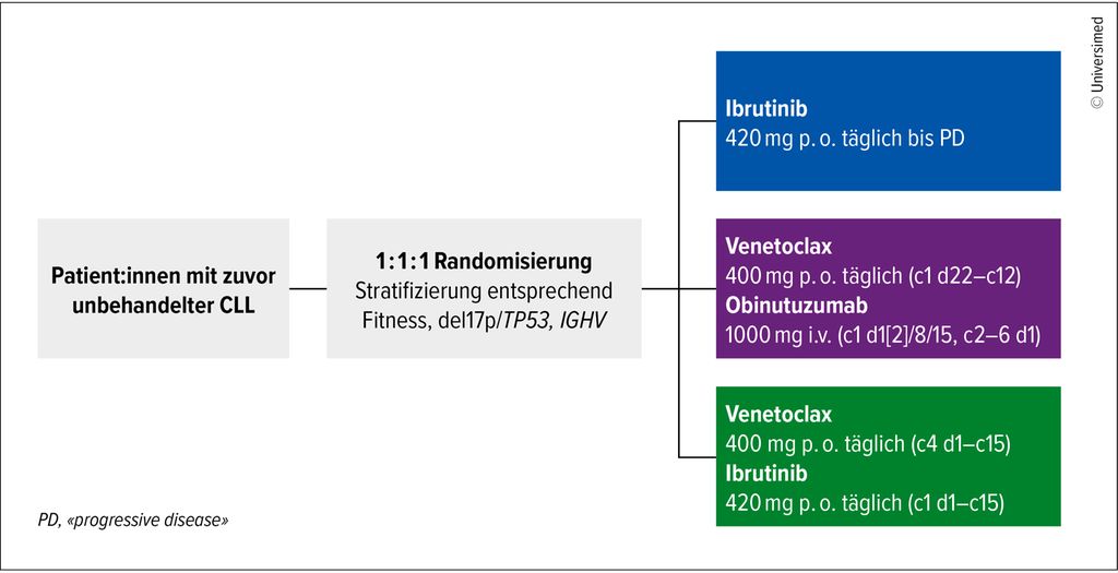 Präsentiert wurden aktualisierte Wirksamkeits- und Sicherheitsdaten der dreiarmigen Phase-III-Studie, in der eine kontinuierliche, rein zielgerichtete Therapie mit zeitlich limitierten Kombinationen verglichen wurde. Konkret wurde Ibrutinib (zeitlich unlimitiert) gegen Venetoclax+Obinutuzumab (zeitlich für ein Jahr limitiert) gegen Venetoclax+Obinutuzumab (zeitlich für ein Jahr limitiert) verglichen, entsprechend 1:1:1 randomisiert sowie nach Fitness, Deletion17p/TP53 sowie IGHV stratifiziert (Abb.1).