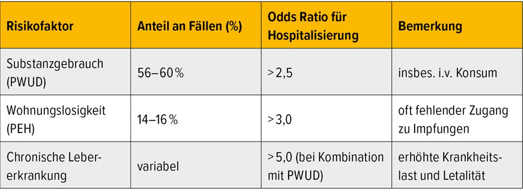 Die epidemiologische Analyse zeigt, dass bis zu 56% der infizierten Personen intravenöse oder nichtintravenöse Drogen konsumierten (Tab.1); in manchen Regionen wurden sogar Werte von über 60% gemeldet.2 Personen ohne festen Wohnsitz machten zwischen 14 und 16% der Fälle aus. Zudem waren Männer, die Sex mit Männern haben (MSM), sowie Personen mit chronischer Hepatitis-B- oder -C-Infektion gefährdet.2 Ferner erhöhte die Kombination mehrerer Risikofaktoren die Krankheitsschwere und -last. Hofmeister et al. berichten von einer kumulativen Odds Ratio von über 5 für Hospitalisierung bei Vorliegen von Substanzkonsum und chronischer Lebererkrankung.3