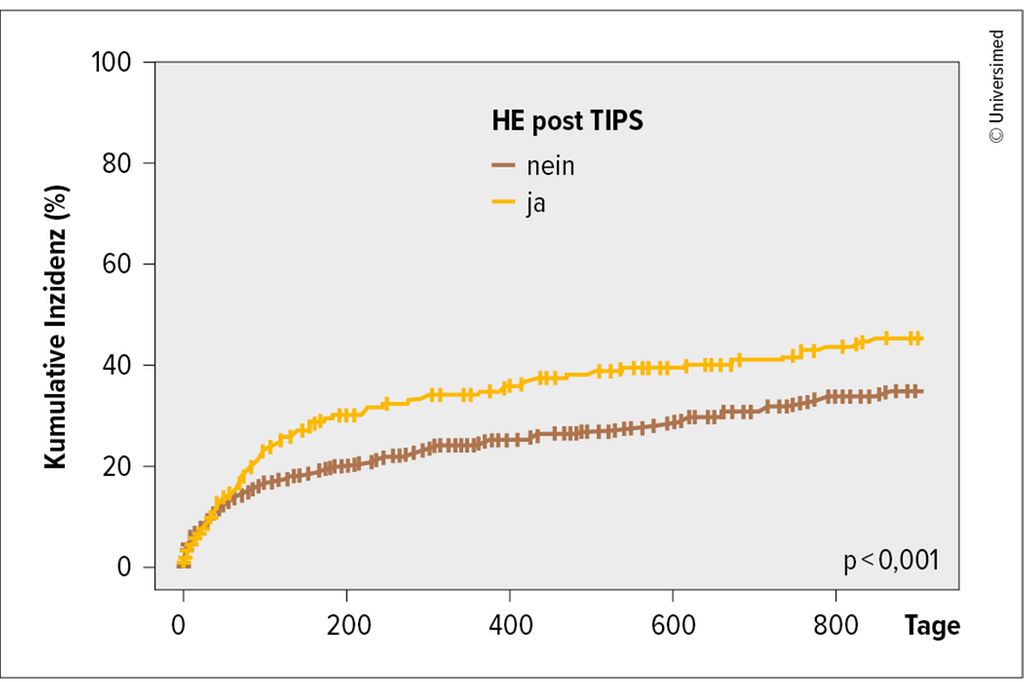 Abb. 2: Kumulative Inzidenz des Todes bei Patient:innen mit/ohne Post-TIPS-HE (modifiziert nach Kabelitz MA et al. 2025)2