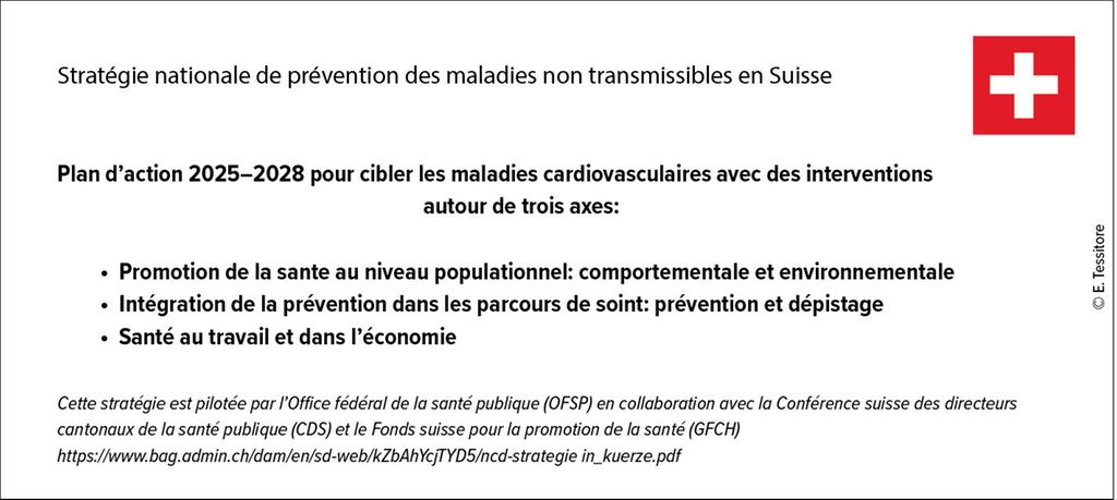 1 Office fédéral de la statistique: Maladies cardiovasculaires. https://www.bfs.admin.ch/bfs/fr/home/statistiques/sante/etat-sante/maladies/cardiovasculaires.html ; dernier accès le 23.10.2025 2 FSO – Swiss Health Survey: Cardiovascular Diseases: prevalence (age: 15+). https://ind.obsan.admin.ch/en/indicator/monam/cardiovascular-diseases-prevalence-age-15 ; dernier accès le 23.10.2025 3 Office fédéral de la statistique: Maladies cardiovasculaires. https://www.bfs.admin.ch/bfs/fr/home/statistiques/sante/etat-sante/maladies/diabete.html ; dernier accès le 23.10.2025 4 Le portail du Gouvernement suisse: Enquête suisse sur la santé 2022: Le surpoids ou l’obésité touchent 43% de la population. https://www.news.admin.ch/fr/nsb?id=103229 ; dernier accès le 23.10.2025 5 Office fédéral de la statistique: Consommation de tabac (âge: 15+). https://ind.obsan.admin.ch/fr/indicator/monam/consommation-de-tabac-age-15 ; dernier accès le 23.10.2025 6 Gaillard L et al.: Trends in avoidable hospitalizations for heart failure in Switzerland (1998–2018): A cross-sectional analysis. Healthcare 2024; 12: 2547 7 Stucki S et al.: What drives health care spending in Switzerland? Findings from a decomposition by disease, health service, sex, and age. BMC Health Serv Res 2023; 23: 1149 8 Reich O et al.: An integrated care model in Switzerland: Evaluation of cost and quality of care. BMC Health Serv Res 2016; 16: 1-9 9 Stehli J, Stähli BE: Sex-specific aspects of the chronic coronary syndrome. Cardiovasc Med 2023; 26: 146-517 10 Krogsbøll LT et al.: General health checks in adults for reducing morbidity and mortality from disease. Cochrane Database Syst Rev 2019; 1: Cd009009 11 Gonzalez-Salvado et al.: SCORE2 risk prediction algorithms: new models to estimate 10-year risk of cardiovascular disease in Europe. Eur Heart J 2021; 42: 2439-54 12 https://agla.ch/fr/calculateurs-outils/calculateur-de-risque-du-gsla ; dernier accès le 23.10.2025 13Dorresteijn JA et al.: Development and validation of a prediction rule for recurrent vascular events based on a cohort study of patients with arterial disease: the SMART risk score. Heart 2013; 99: 866-72 14 Kaasenbrood L et al.: Estimated life expectancy without recurrent cardiovascular events in patients with vascular disease: The SMART-REACH model. J Am Heart Assoc 2018; 7: e009217 15 Visseren FLJ: 2021 ESC Guidelines on cardiovascular disease prevention in clinical practice: Developed by the Task Force for cardiovascular disease prevention in clinical practice with representatives of the European Society of Cardiology and 12 medical societies With the special contribution of the European Association of Preventive Cardiology (EAPC). Eur Heart J 2021; 42: 3227-337 16 Ambrosetti M et al.: Secondary prevention through comprehensive cardiovascular rehabilitation: From knowledge to implementation. 2020 update. A position paper from the Secondary Prevention and Rehabilitation Section of the European Association of Preventive Cardiology. Eur J Prev Cardiol 2021; 28: 460-95 17 Cuomo G et al.: Exercise training in patients with heart failure: from pathophysiology to exercise prescription. Rev Cardiovasc Med 2022; 23: 144 18 Tessitore E et al.: Cardiovascular rehabilitation delivery and outcomes in Switzerland in more than a hundred thousand patients over the last decade. J Cardiopul Rehabil Prev 2023; 43: 305-7 19 Prasad K: Current status of primary, secondary, and tertiary prevention of coronary artery disease. Int J Angiol 2021; 30: 177-86