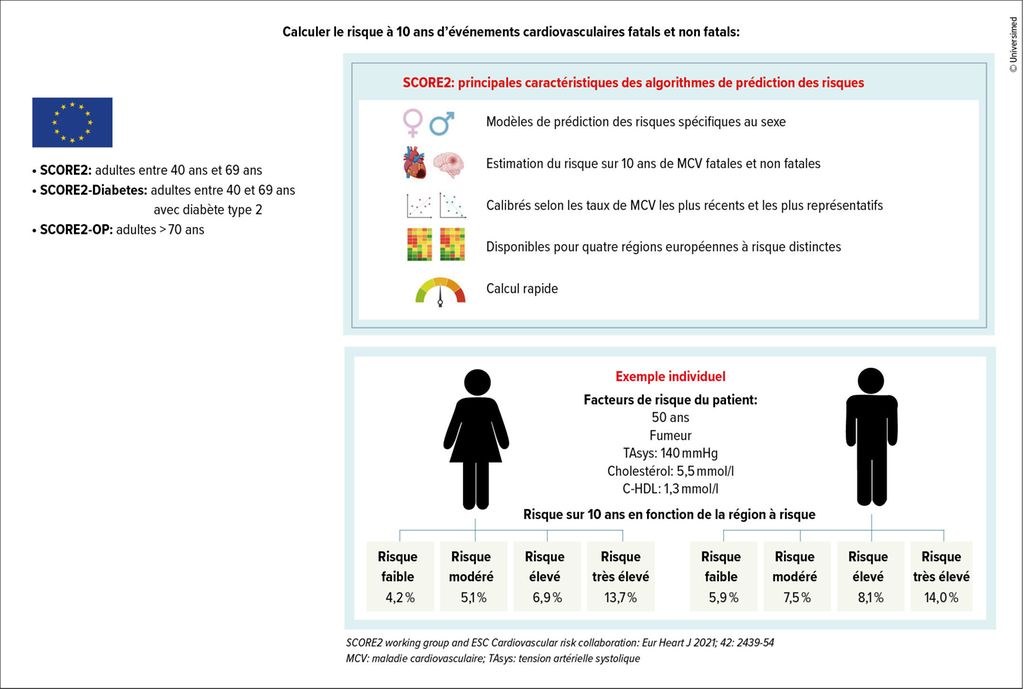 Les outils principaux incluent les scores «SCORE2», «SCORE2-OP» et «SCORE2-Diabetes», qui estiment le risque à 10 ans d’événements cardiovasculaires fatals et non fatals.11 Ces scores, validés par la Société Européenne de Cardiologie, prennent en considération le pays d’origine européen (risque faible, risque modéré, risque élevé ou risque très élevé), le sexe, l’âge, le tabagisme, la pression artérielle systolique, ainsi que le cholestérol total et le cholestérol HDL, et estiment en pourcentage le risque actuel d’événement cardiovasculaire au cours des 10 prochaines années (Fig.1).