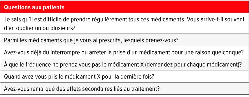 1 Cutler RL et al.: Economic impact of medication non-adherence by disease groups: a systematic review. BMJ Open 2018; 8: e016982 2 Granger BB et al.: Adherence to candesartan and placebo and outcomes in chronic heart failure in the CHARM programme: double-blind, randomised, controlled clinical trial. Lancet 2005; 366: 2005-11 3 Centers for Disease Conrol and Prevention (CDC): Chronic Disease. Atlanta, Georgia, USA. www.cdc.gov; dernier accès le 4.10.2025 4 Foley L et al.: Prevalence and predictors of medication non-adherence among people living with multimorbidity: a systematic review and meta-analysis. BMJ Open 2021; 11: e044987 5 Lee EKP et al.: Global burden, regional differences, trends, and health consequences of medication nonadherence for hypertension during 2010 to 2020: a meta-analysis involving 27 million patients. J Am Heart Assoc 2022; 11: e026582 6 Durand H et al.: Medication adherence among patients with apparent treatment-resistant hypertension: systematic review and meta-analysis. J Hypertens 2017; 35: 2346-57r 7 Vrijens B et al.: A new taxonomy for describing and defining adherence to medications. Br J Clin Pharmacol 2012; 73: 691-705 8 Fischer MA et al.: Primary medication non-adherence: analysis of 195,930 electronic prescriptions. J Gen Intern Med 2010; 25: 284-90 9 Burnier M et al.: Adherence in hypertension. Circ Res 2019; 124: 1124-40 10 Shah ND et al.: Long-term medication adherence after myocardial infarction: experience of a community. Am J Med 2009; 122: 961.e7-13 11 Choudhry NK et al.: Medication adherence and blood pressure control: a scientific statement from the American Heart Association. Hypertension 2022; 79: e1-e14 12 National Community Pharmacists Association (NCPA): Medication adherence in America: A national report 2013. Alexandria, Virginia, USA; 2013. ncpanet.org; dernier accès le 4.10.2025 13 Gupta P et al.: Risk factors for nonadherence to antihypertensive treatment. Hypertension 2017; 69: 1113-20 14 Naderi et al.: Adherence to drugs that prevent cardiovascular disease: meta-analysis on 376,162 patients. Am J Med 2012; 125: 882-7.e1 15 Brown MT et al.: Medication adherence: WHO cares? Mayo Clin Proc 2011; 86: 304-14 16 Gupta P et al.: Biochemical screening for nonadherence is associated with blood pressure reduction and improvement in adherence. Hypertension 2017; 70: 1042-8 17 Burnier M: Drug adherence in hypertension. Pharmacol Res 2017; 125: 142-9 18 Parati G et al.: Adherence to single-pill versus free-equivalent combination therapy in hypertension: a systematic review and meta-analysis. Hypertension 2021; 77: 692-705 19 Schmieder RE et al.: Improved persistence to medication, decreased cardiovascular events and reduced all-cause mortality in hypertensive patients with use of single-pill combinations: results from the START-Study. Hypertension 2023; 80: 1127-35 20 Bokrantz T et al.: Antihypertensive drug classes and the risk of hip fracture: results from the Swedish primary care cardiovascular database. J Hypertens 2020; 38: 167-75 21 Santo K et al.: Medication reminder applications to improve adherence in coronary heart disease: a randomised clinical trial. Heart 2019; 105: 323-9 22 Choudhry NK et al.: Reminder devices on medication adherence: the REMIND randomized clinical trial. JAMA Intern Med 2017; 177: 624-31 23 Delavar F et al.: The effects of self-management education tailored to health literacy on medication adherence and blood pressure control among elderly people with primary hypertension: a randomized controlled trial. Patient Educ Couns 2020; 103: 336-42 24 Zuo HJ et al.: The impact of routine follow-up with health care teams on blood pressure control among patients with hypertension. J Hum Hypertens 2019; 33: 466-74 25 Asch DA et al.: Effect of financial incentives to physicians, patients, or both on lipid levels: a randomized clinical trial. JAMA 2015; 314: 1926-35 26 Peasah SK et al.: Assessing the impact of a financial incentive and refill reminder program on medication adherence and costs. J Manag Care Spec Pharm 2024; 30: 43-51 27 Lázaro P et al.: Therapeutic inertia in the outpatient management of dyslipidemia in patients with ischemic heart disease. The inertia study. Rev Esp Cardiol 2010; 63: 1428-37