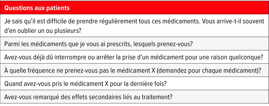 «On peut très clairement affirmer que l’approche ‹one-size-fits-all› ne fonctionne pas en ce qui concerne l’adhésion, mais que des solutions individuelles sont nécessaires. La première étape consiste à identifier le problème», a souligné A. Vischer. Dans ce cas, un questionnement ciblé, empathique et sans jugement peut souvent aider les patient·es à surmonter leur réticence à aborder le sujet de leur propre gré et à les sensibiliser à la prise correcte du médicament prescrit (Tab.1).15 «Cela prend certes du temps, mais cela en vaut la peine à long terme», a déclaré A. Vischer sur la base de son expérience.