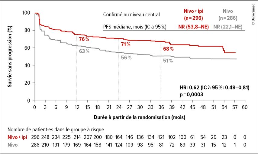 La durée de traitement médiane par nivolumab+ipilimumab a été de 20,5 mois par rapport à 16,4 mois pour le nivolumab en monothérapie. La PFS a été prolongée de manière cliniquement et statistiquement significative par l’ajout d’ipilimumab (HR: 0,62; IC à 95%: 0,48–0,81; p=0,0003; Fig. 2). Les taux de PFS étaient de 76 par rapport à 63% à 12 mois, 71 par rapport à 56% à 24 mois et 68 par rapport à 51% à 36 mois. Dans le bras sous nivolumab en monothérapie, les patient·es avec MSI-H/dMMR confirmée (81–84% de l’ensemble des patient·es randomisé·es) ont vécu en médiane 39,3 mois sans progression. Dans le bras sous traitement combiné, la PFS médiane n’a pas encore été atteinte.