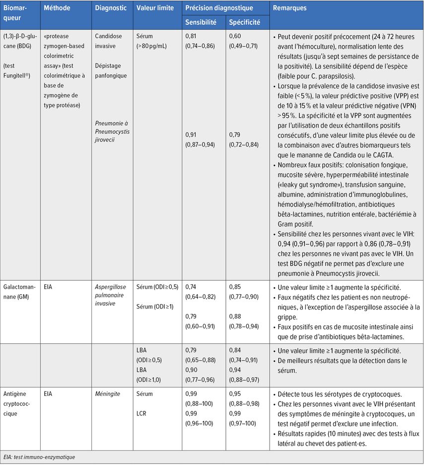 Le dosage de différents biomarqueurs joue un rôle important dans le dépistage des infections fongiques invasives. L’évaluation d’un biomarqueur positif en cas d’infections fongiques dépend de la probabilité clinique pré-test, de la spécificité/sensibilité du test, du tableau clinique et de la dynamique des valeurs du biomarqueur. Un résultat positif doit toujours être interprété avec d’autres résultats afin de diagnostiquer ou d’exclure avec certitude une infection fongique invasive.