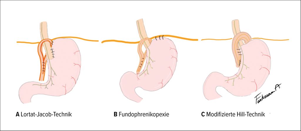 Anatomisch schonende Alternativen zur klassischen Fundoplikatio ermöglichen eine sehr gute Symptomkontrolle bei geringerer Nebenwirkungsrate und sind insbesondere für Patient:innen interessant, für die physiologische Funktionen wie Rülpsen und die Fähigkeit zu erbrechen wichtig sind. Das Hauptziel bei der anatomischen Rekonstruktion ist es – genau so wie bei der Fundoplikatio –, die Antirefluxbarriere zu stärken. Operationstechniken basieren auf der Lortat-Jacob-Technik, der Fundophrenikopexie oder der modifizierten Hill-Technik (Abb.4). Bei der Lortat-Jacob-Technik wird die mediale Konvexität des Fundus am links-lateralen distalen Ösophagussegment fixiert. Bei der Fundophrenikopexie wird der Fundus am linken Zwerchfell fixiert, während bei der modifizierten Hill-Technik die phrenoösophageale Membran am rechten Zwerchfellschenkel pexiert wird.