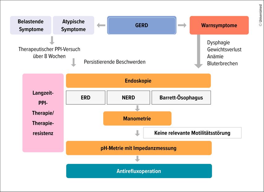 Bei typischen GERD-Symptomen ohne Alarmzeichen sollte gemäss S2k-Leitlinien zunächst eine empirische Therapie begonnen werden (Abb.2). Diese beinhaltet Lebensstiländerungen wie Gewichtsreduktion, Ernährungsanpassung, Hochlagerung des Kopfendes des Bettes und das Vermeiden spätabendlicher Mahlzeiten sowie einen 8-wöchigen Therapieversuch mit einem PPI (z.B. Omeprazol 20mg einmal täglich 30–60 Minuten vor dem Frühstück). Dieses Vorgehen empfehlen auch das American College of Gastroenterology und die American Gastroenterological Association. Bei fehlendem Ansprechen auf PPI, unklarer Diagnose oder Warnsymptomen ist eine Ösophagogastroduodenoskopie indiziert. Bei Patient:innen mit NERD und fortbestehenden Symptomen sollte eine 24-Stunden-pH-Metrie mit Impedanzmessung durchgeführt werden, um nicht sauren Reflux bzw. Volumenreflux als Ursache der Beschwerden zu identifizieren.3 Eine Manometrie ist bei Verdacht auf eine Motilitätsstörung indiziert und sollte vor einer chirurgischen Therapie, insbesondere um eine Achalasie auszuschliessen, durchgeführt werden.11 Während der Grossteil der Patient:innen mit GERD gut auf Lebensstilmodifikationen und eine Therapie mit PPI anspricht, besteht bei einem bestimmten Anteil die Notwendigkeit einer chirurgischen Intervention.12 Die Indikationen für die chirurgische Therapie bei Patient:innen mit GERD umfassen: