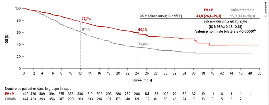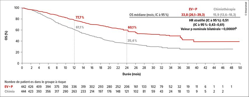 Fig.1: Survie globale (OS) sous enfortumab vedotin (EV) plus pembrolizumab (P) par rapport à la chimiothérapie (modifiée selon Powles T et al.)3