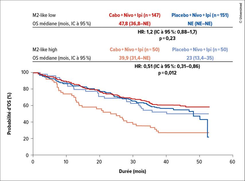 Fig.2: Survie globale (OS) sous nivolumab (Nivo) plus ipilimumab (Ipi) avec ou sans cabozantinib (Cabo) en cas d’expression faible (low) ou élevée (high) des macrophages M2-like (modifiée selon Albiges L et al.)4