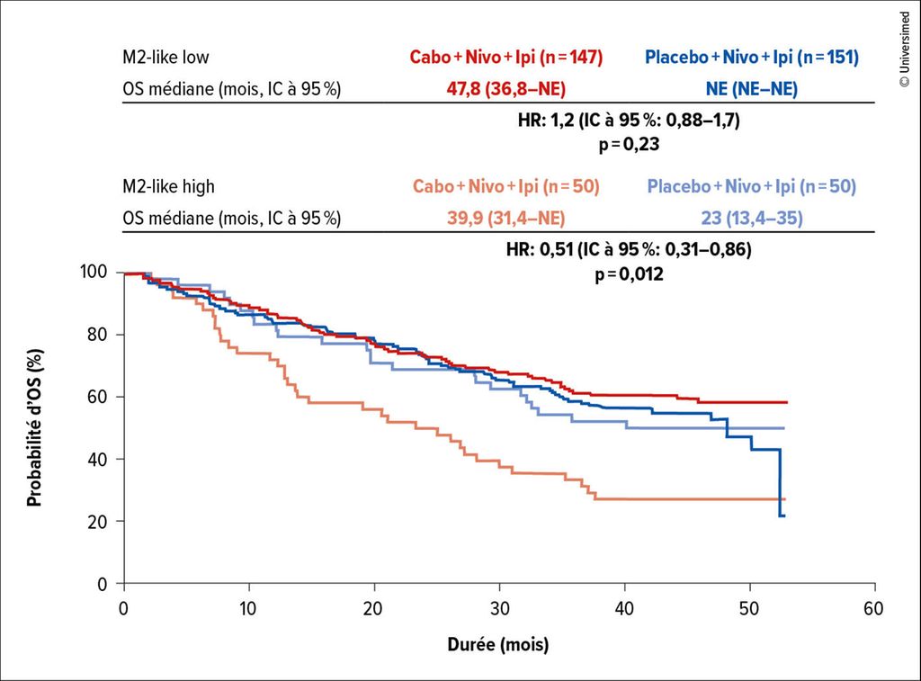 Les analyses exploratoires des biomarqueurs des séquences d’ARN n’ont montré aucun lien clair entre les groupes moléculaires et le succès thérapeutique. Un effet du cabozantinib sur différents types de cellules immunitaires a également été étudié et a montré que les macrophages M2-like supprimaient la réponse immunitaire. Les patient·es présentant un risque de progression plus élevé et des métastases viscérales avaient des taux plus élevés de macrophages M2-like. L’ajout du cabozantinib à la double immunothérapie a permis d’inverser le pronostic défavorable dû à l’immunosuppression médiée par les macrophages M2-like (Fig. 2).