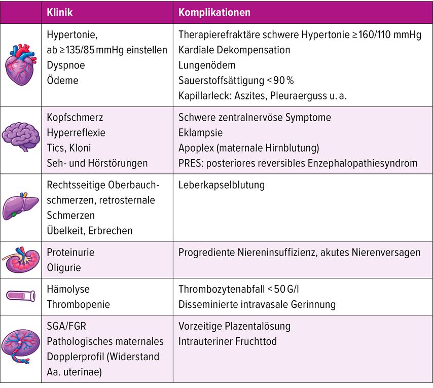 Tab. 2: Klinische Zeichen und schwere Komplikationen bei Präeklampsie (modifiziert nach AWMF-Leitlinie)7