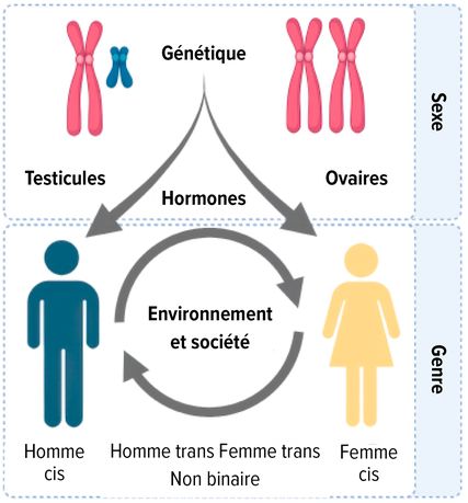 La médecine de genre s’intéresse au sexe biologique et au genre socioculturel, qui sont souvent difficiles à dissocier et s’influencent mutuellement (Fig.1). Il est crucial que la médecine prenne en compte ces deux aspects, car ils ont un impact significatif sur la survenue, la perception et le traitement des maladies.