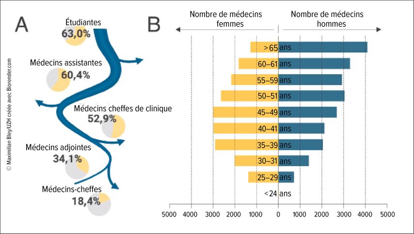 Fig.2: Répartition par sexe des médecins suisses selon le niveau de formation et l’âge. Représentation schématique de la diminution de la proportion de femmes entre la phase des études et le poste de cheffe (A) ainsi que du nombre absolu de médecins par âge (B)