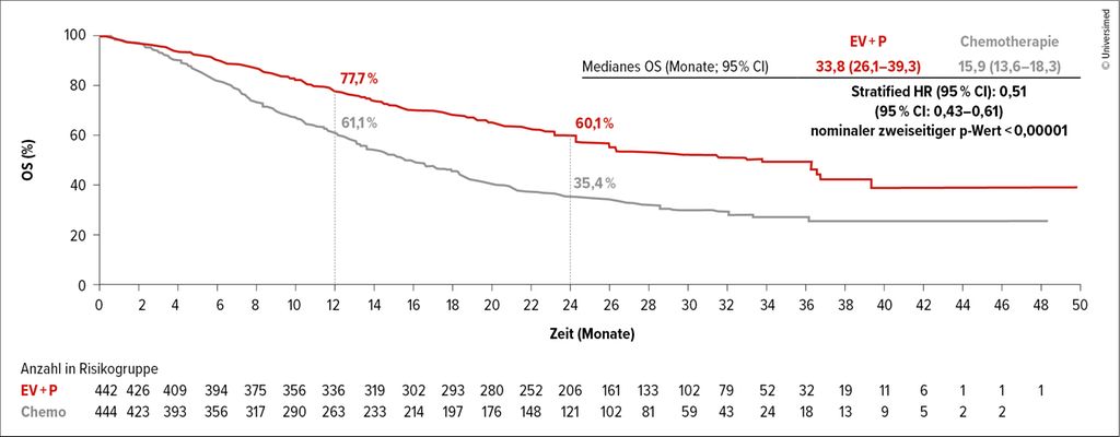 Abb. 1: Gesamtüberleben (OS) unter Enfortumab Vedotin (EV) plus Pembrolizumab (P) vs. Chemotherapie (modifiziert nach Powles T et al.)3