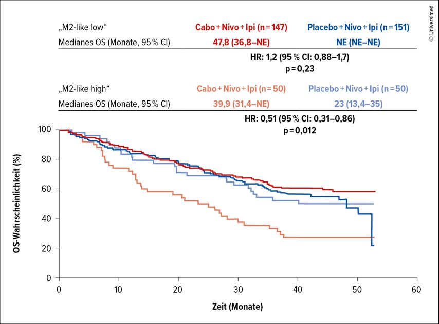 Explorative Biomarker-Analysen der RNA-Sequenzen zeigten keinen eindeutigen Zusammenhang zwischen den molekularen Gruppen und dem Therapieerfolg. Ein Effekt von Cabozantinib auf verschiedene Immunzelltypen wurde ebenfalls untersucht und zeigte, dass „M2-like“ Makrophagen die Immunantwort unterdrücken. Patient:innen mit einem höheren Progressionsrisiko und mit Viszeralmetastasen wiesen höhere Spiegel von „M2-like“ Makrophagen auf. Die zusätzliche Gabe von Cabozantinib zur Immunkombination hob die schlechtere Prognose durch die durch „M2-like“ Makrophagen vermittelte Immunsuppression auf (Abb. 2).