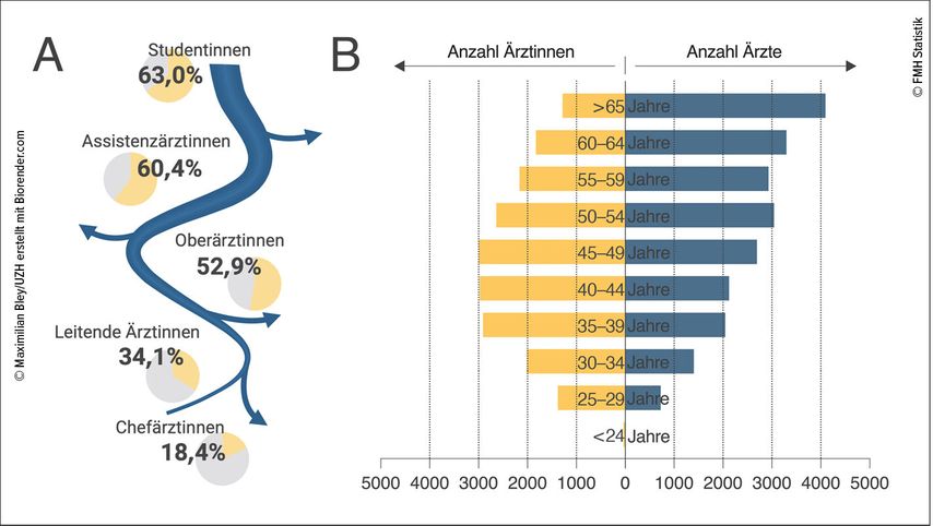 Abb. 2: Geschlechteranteil von Schweizer Ärzt:innen nach Ausbildungsstand und Alter. Schematisch verdeutlicht sind der abnehmende prozentuale Anteil von Frauen zwischen Studium und Chefposition (A) sowie die absolute Anzahl von Ärzt:innen geordnet nach Alter (B)