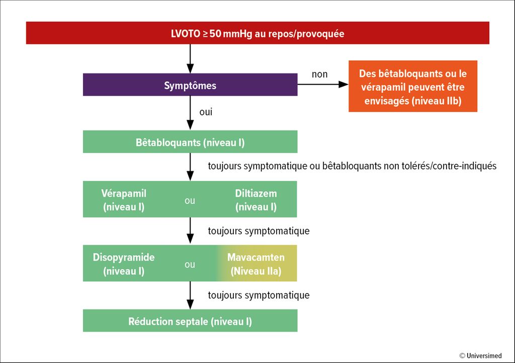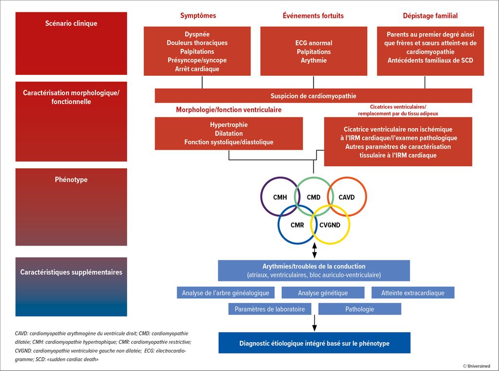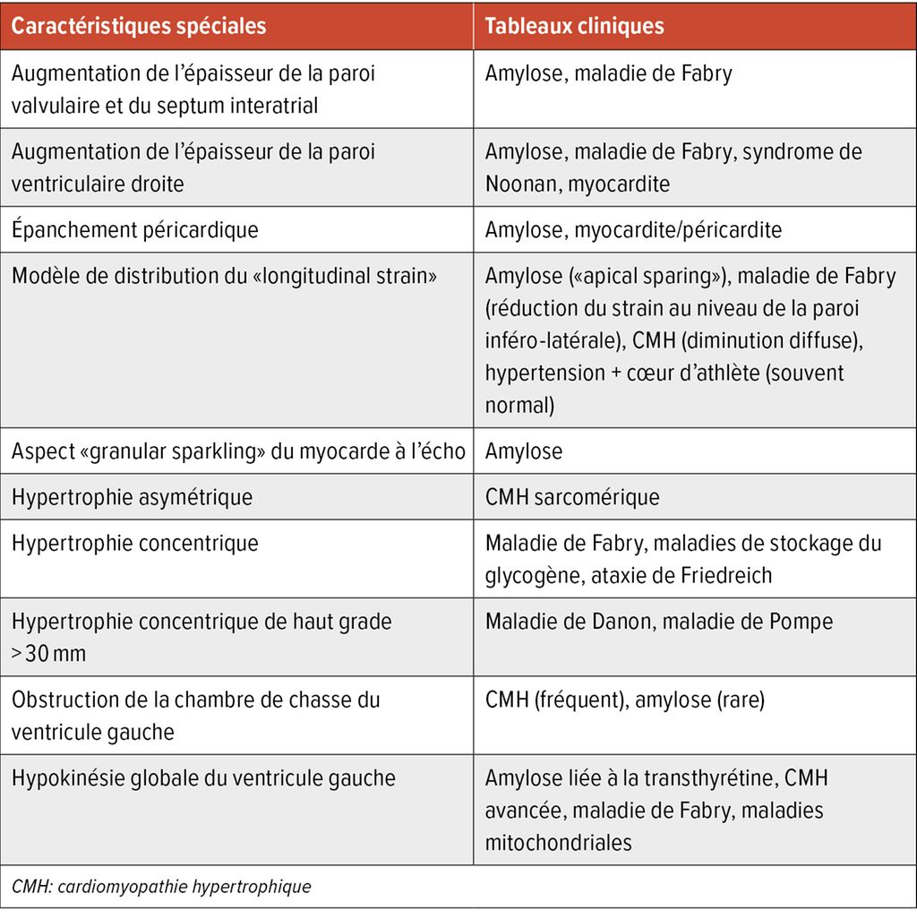 Une CMH existe en cas d’augmentation de l’épaisseur ≥15mm dans un segment myocardique, si cette augmentation ne peut pas être expliquée uniquement par des conditions de remplissage anormales telles qu’une sténose de la valve aortique ou une hypertension. Chez les parents, en cas de formes génétiques ou de modifications typiques de l’ECG, une augmentation moindre de l’épaisseur de la paroi (13–14mm) peut toutefois déjà être présente.1 Sur le plan clinique, des troubles tels qu’une dyspnée, une angine de poitrine, des vertiges ou une syncope sont décrits en plus des arythmies.
