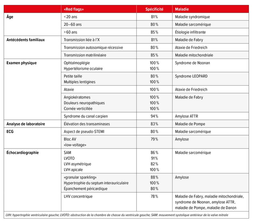 Tab. 1: Résumé des «red flags» pertinents (spécificité >75%) qui permettent de suspecter une cause spécifique en cas de cardiomyopathie hypertrophique (adapté selon Maurizi N et al. 2025)1