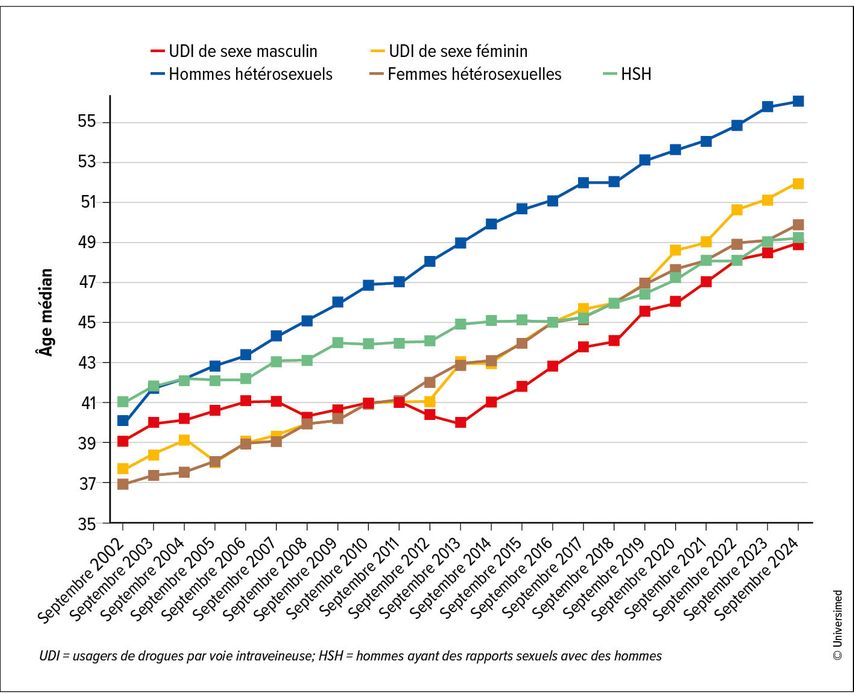 Avec les progrès de la médecine au cours des dernières décennies, le pronostic des personnes vivant avec le VIH s’est amélioré de manière spectaculaire. Le VIH est aujourd’hui une maladie chronique qui peut être traitée grâce aux TAR, sous réserve de la bonne adhésion thérapeutique des patient·es. Les personnes vivant avec le VIH ont aujourd’hui une espérance de vie presque normale, à condition d’être diagnostiquées à un stade précoce et de bénéficier d’un suivi médical régulier.1 Cette évolution a pour conséquence que de plus en plus de personnes vivant avec le VIH arrivent à un âge avancé. Dans l’étude AHIVCOS, l’âge médian était de 39,2 ans en 2002 et de 50,8 ans en septembre 2024.2 En Europe, selon les données actuelles, environ 50% des personnes vivant avec le VIH ont déjà plus de 50 ans, ce pourcentage étant encore plus élevé dans certaines régions urbaines.3 Les défis qui en découlent sont multiples et vont des complications médicales aux impacts psychosociaux, en passant par des structures de soins qui ne sont pas encore préparées à ce groupe de patient·es.