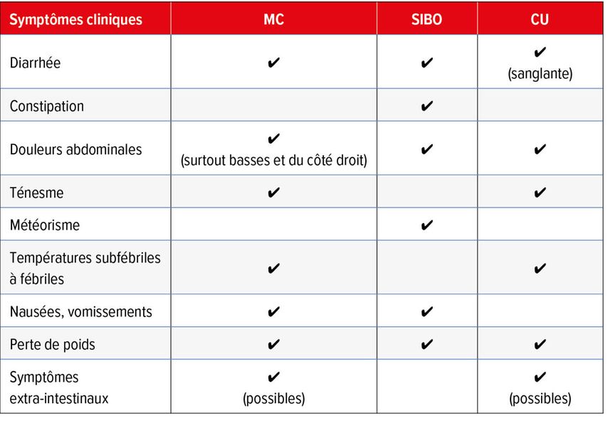 Tab. 1: Symptômes cliniques de la maladie de Crohn (MC), de la pullulation bactérienne de l’intestin grêle (SIBO) et de la colite ulcéreuse (CU)