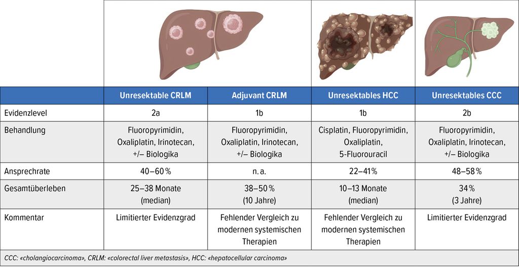 1 Lam VW et al.: A systematic review of clinical response and survival outcomes of downsizing systemic chemotherapy and rescue liver surgery in patients with initially unresectable colorectal liver metastases. Ann Surg Oncol 2012; 19(4): 1292-1301 2 Safi F et al.: Regional chemotherapy for hepatic metastases of colorectal carcinoma (continuous intraarterial versus continuous intraarterial/intravenous therapy). Results of a controlled clinical trial. Cancer 1989; 64(2): 379-87 3 DʼAngelica MI et al.: Phase II trial of hepatic artery infusional and systemic chemotherapy for patients with unresectable hepatic metastases from colorectal cancer: conversion to resection and long-term outcomes. Ann Surg 2015; 261(2): 353-60 4 Pak LM et al.: Prospective phase II trial of combination hepatic artery infusion and systemic chemotherapy for unresectable colorectal liver metastases: long term results and curative potential. J Surg Oncol 2018; 117(4): 634-43 5 Kemeny NE et al.: Conversion to resectability using hepatic artery infusion plus systemic chemotherapy for the treatment of unresectable liver metastases from colorectal carcinoma. JClin Oncol 2009; 27(21): 3465-71 6 Boige V et al.: Hepatic arterial infusion of oxaliplatin and intravenous LV5FU2 in unresectable liver metastases from colorectal cancer after systemic chemotherapy failure. Ann Surg Oncol 2008; 15(1): 219-26 7 Srouji R et al.: Addition of adjuvant hepatic artery infusion to systemic chemotherapy following resection of colorectal liver metastases is associated with reduced liver-related mortality. J Surg Oncol 2020; 121(8): 1314-9 8 Ecker BL et al.: Genomic stratification of resectable colorectal liver metastasis patients and implications for adjuvant therapy and survival. Ann Surg 2022; 275(2): 371-81 9 Reig M et al.: BCLC strategy for prognosis prediction and treatment recommendation: the 2022 update. J Hepatol 2022; 76(3): 681-93 10 Tschuor C et al.: Allocation of liver grafts worldwide - is there a best system? J Hepatol 2019; 71(4): 707-18 11 Ikeda M et al.: Sorafenib plus hepatic arterial infusion chemotherapy with cisplatin versus sorafenib for advanced hepatocellular carcinoma: randomized phase II trial. Ann Oncol 2016; 27(11): 2090-6 12 He M et al.: Sorafenib plus hepatic arterial infusion of oxaliplatin, fluorouracil, and leucovorin vs sorafenib alone for hepatocellular carcinoma with portal vein invasion: a randomized clinical trial. JAMA Oncol 2019; 5(7): 953-60 13 Kudo M et al.: Sorafenib plus low-dose cisplatin and fluorouracil hepatic arterial infusion chemotherapy versus sorafenib alone in patients with advanced hepatocellular carcinoma (SILIUS): a randomised, open label, phase 3 trial. Lancet Gastroenterol Hepatol 2018; 3(6): 424-32 14 Zheng K et al.: Sorafenib plus hepatic arterial infusion chemotherapy versus sorafenib for hepatocellular carcinoma with major portal vein tumor thrombosis: a randomized trial. Radiology 2022; 303(2): 455-64 15 Marcus R et al.: Systemic therapy is associated with improved oncologic outcomes in resectable stage II/III intrahepatic cholangiocarcinoma: an examination of the National Cancer Database over the past decade. Cancers (Basel) 2022; 14(17): 4320 16 Cercek A et al.: Assessment of hepatic arterial infusion of floxuridine in combination with systemic gemcitabine and oxaliplatin in patients with unresectable intrahepatic cholangiocarcinoma: aphase 2 clinical trial. JAMA Oncol 2020; 6(1): 60-7 17 Ghiringhelli F et al.: Hepatic arterial infusion of gemcitabine plus oxaliplatin as second-line treatment for locally advanced intrahepatic cholangiocarcinoma: preliminary experience. Chemotherapy 2013; 59(5): 354-60 18 Franssen S et al.: Gemcitabine with cisplatin versus hepatic arterial infusion pump chemotherapy for liver-confined unresectable intrahepatic cholangiocarcinoma. Ann Surg Oncol 2024; 31(1): 115-124 19 Franssen S et al.: Comparison of hepatic arterial infusion pump chemotherapy vs resection for patients with multifocal intrahepatic cholangiocarcinoma. JAMA Surg 2022; 157(7): 590-6