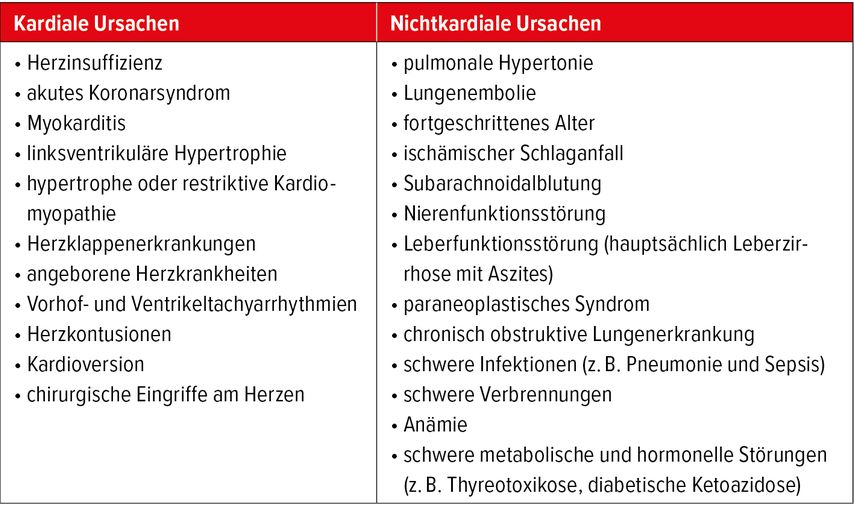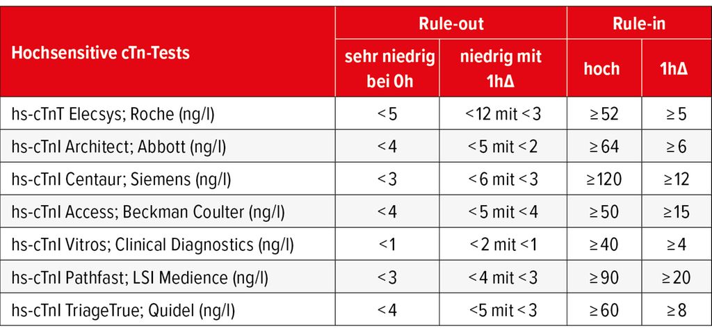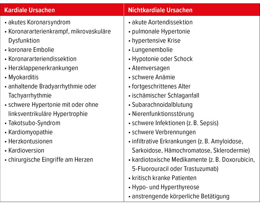 Kardiales Troponin I (cTnI) und kardiales Troponin T (cTnT) bilden zusammen mit Troponin C und Tropomyosin einen Komplex, der die Herzmuskelkontraktion in Abhängigkeit von Kalzium reguliert. Nach einer Schädigung von Kardiomyozyten steigen ihre Konzentrationen im Blut rasch an. Tabelle 1 listet mögliche Ursachen für einen erhöhten Plasmaspiegel von kardialen Troponinen auf. Aufgrund ihrer hohen Sensitivität gelten kardiale Troponine als Goldstandard für die Diagnose eines akuten Myokardinfarkts. Die aktuellen Leitlinien der Europäischen Gesellschaft für Kardiologie (ESC) empfehlen den Einsatz hochsensitiver (hs) Troponin-Tests bei Patienten mit Verdacht auf ein akutes Koronarsyndrom (ACS), insbesondere wenn im Elektrokardiogramm keine ST-Streckenhebung erkennbar ist, weil diese Tests bereits 1 bis 3 Stunden nach Symptombeginn einer kardialen Ischämie den Nachweis erhöhter Troponin-Konzentrationen (>99. Perzentile der gesunden Population) ermöglichen. cTnI und cTnT bieten eine vergleichbare diagnostische Genauigkeit für die Diagnose eines Myokardinfarkts. Diagnostische Algorithmen wie der 0h/1h- oder 0h/2h-Algorithmus (bezogen auf den Zeitpunkt der Blutentnahme zur Bestimmung von kardialen Troponinen) mit testspezifischen Grenzwerten ermöglichen einen schnellen und sicheren Ausschluss eines akuten Myokardinfarkts mit einem negativen Vorhersagewert und einer Sensitivität von über 99%. Diese Algorithmen sollten jedoch nur bei Patienten mit Verdacht auf ein ACS angewendet werden und nicht bei unselektierten Patientengruppen wie z.B. Patienten mit Sepsis oder Schlaganfall.1