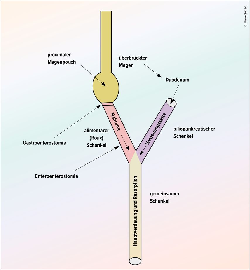 Wie sich zeigte, waren alle Patienten aufgrund einer schweren Adipositas mit einem hypoabsorptiv wirkenden «distalen very long Roux-Y-Magenbypass» (DVLRYGB) behandelt worden, eine Magenbypass-Variante, die gemäss Peterli heute nicht mehr empfohlen werden kann. In einer retrospektiven Untersuchung aus der Schweiz bei 355 Patienten mit einem sehr langen «alimentären (Roux) Schenkel» von 604 ± 99cm, einem «gemeinsamen Schenkel» von 76 ± 7cm und einem «biliopankreatischen Schenkel» von 79 ± 14 cm (Abb. 1) konnte eine Übergewichtsreduktion von >74% erreicht werden mit einer relativ niedrigen Inzidenz an unerwünschten Wirkungen wie Ernährungsmangelzuständen etc. bei einer Nachkontrollzeit von 5 Jahren.5 Wie die erwähnten Langzeitkomplikationen aber zeigen, ist diese Variante der Magenbypassoperation sehr gefährlich. «Es wird vermutet, dass die lange alimentäre und sehr kurze gemeinsame Schlinge einen toxischen Effekt auf die Leber haben», erläuterte Peterli.6 Diese Operation ist nicht mehr unter den Standardeingriffen in den SMOB-Richtlinien (www.smob.ch) erwähnt.7