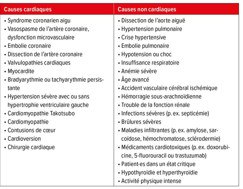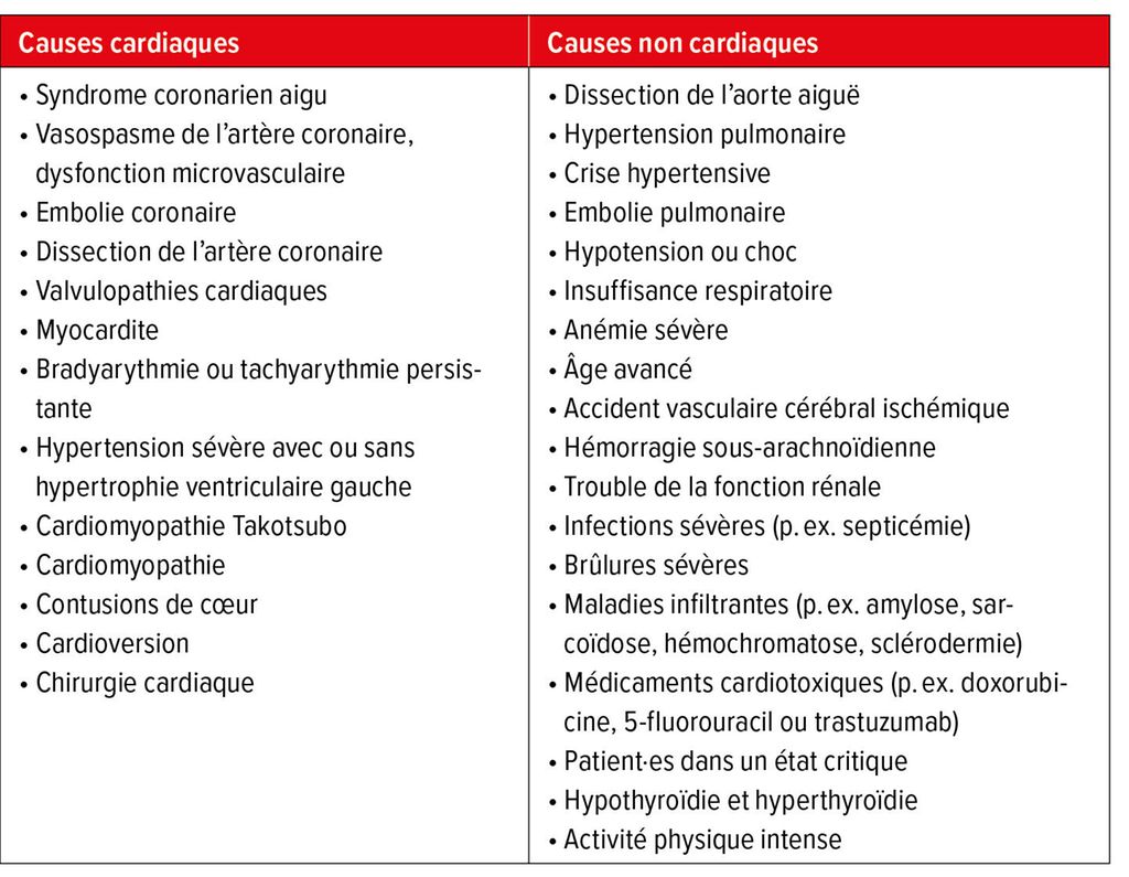 La troponine I cardiaque (cTnI) et la troponine T cardiaque (cTnT) forment, avec la troponine C et la tropomyosine, un complexe qui régule la contraction du myocarde en fonction du calcium. Après une lésion des cardiomyocytes, leurs concentrations dans le sang augmentent rapidement. Le Tableau 1 énumère les causes possibles d’un taux plasmatique élevé de troponines cardiaques. En raison de leur sensibilité élevée, elles sont considérées comme la référence pour le diagnostic de l’infarctus aigu du myocarde. Les directives actuelles de la Société européenne de cardiologie (ESC) recommandent l’utilisation de tests des troponines ultrasensibles (hs) chez les patient·es avec suspicion de syndrome coronarien aigu (SCA), en particulier lorsque l’ECG ne révèle aucune élévation du segment ST, car ces tests permettent de détecter des concentrations élevées de troponines (>99e percentile de la population en bonne santé) dès 1 à 3 heures après le début des symptômes d’ischémie cardiaque. Les cTnI et cTnT offrent une précision diagnostique comparable pour le diagnostic d’un infarctus du myocarde. Des algorithmes diagnostique tels que l’algorithme 0h/1h ou 0h/2h (par rapport à l’heure du prélèvement sanguin pour le dosage des troponines cardiaques) avec des valeurs limites spécifiques au test permettent d’exclure rapidement et avec certitude un infarctus aigu du myocarde avec une valeur prédictive négative et une sensibilité >99%. Toutefois, ces algorithmes doivent uniquement être utilisés chez les patient·es avec suspicion de SCA et non dans des groupes de patient·es non sélectionné·es, tels que les patient·es souffrant de septicémie ou ayant fait un AVC.1
