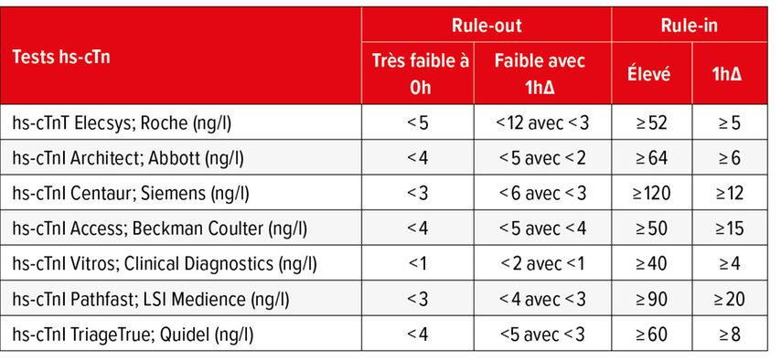 Tab.2: Valeurs limites hs-cTn sélectionnées spécifiques au test pour l’algorithme 0h/1h en cas de suspicion de syndrome coronarien aigu2