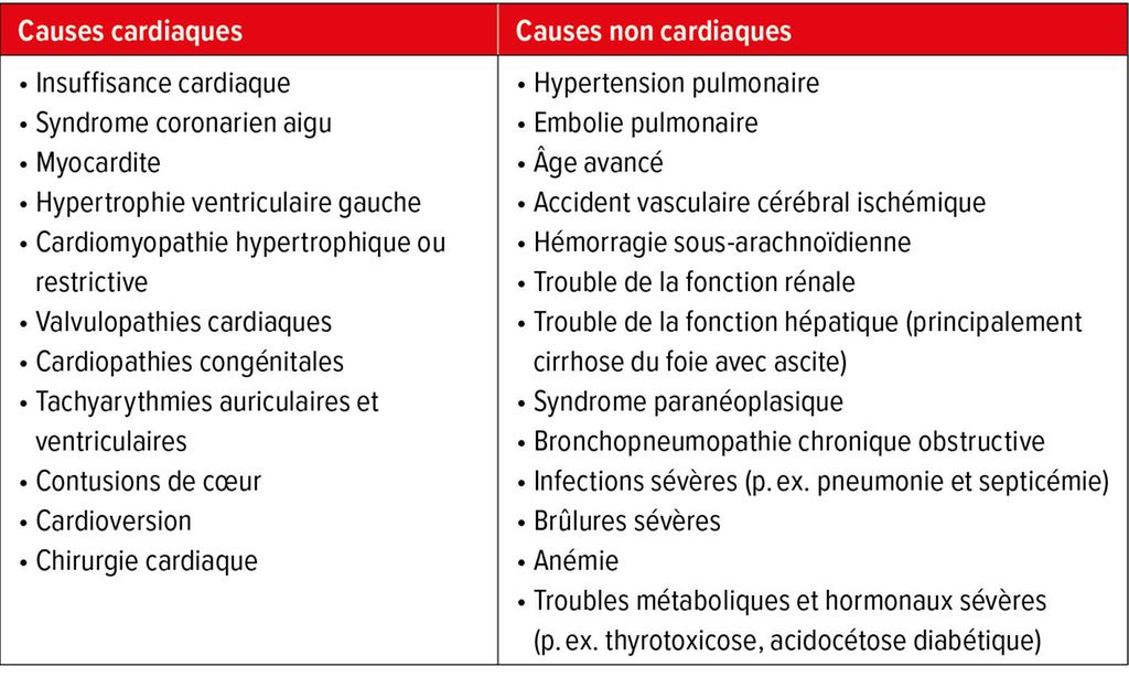 Le peptide natriurétique de type B (BNP) est une hormone peptidique libérée par les ventricules en réponse à la distension accrue du myocarde. En tant qu’antagoniste du système rénine-angiotensine-aldostérone (SRAA), il provoque une vasodilatation et une augmentation de la natriurèse ainsi que de la diurèse, ce qui entraîne une diminution du volume plasmatique et de la pression artérielle, réduisant ainsi le travail du cœur. Le fragment N-terminal inactif de la prohormone BNP (NT-proBNP), qui est libéré de manière équimolaire avec le BNP, est plus souvent utilisé comme biomarqueur dans la pratique clinique quotidienne en raison de sa meilleure stabilité ex vivo et de sa demi-vie plus longue. Le Tableau 3 présente les causes possibles de l’augmentation des taux plasmatiques de peptides natriurétiques.