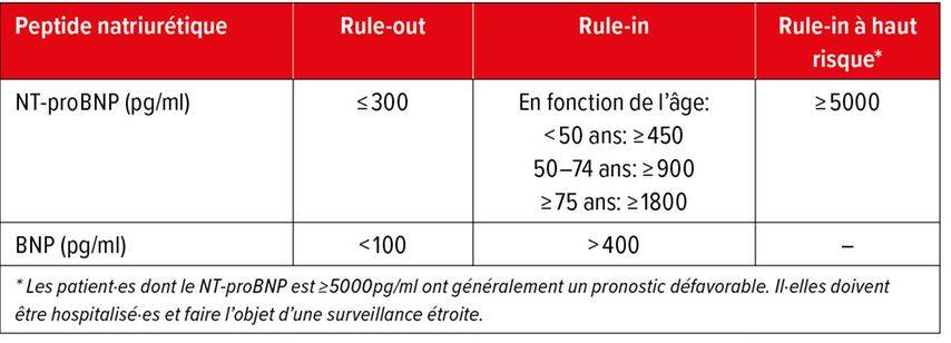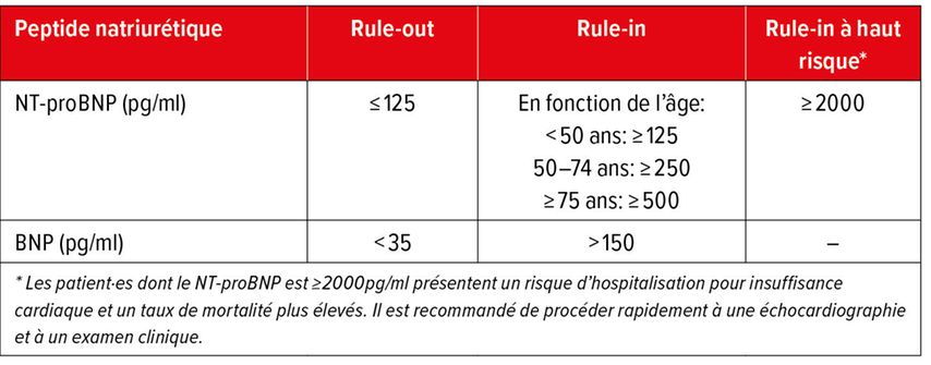 En raison de symptômes non spécifiques, le diagnostic d’insuffisance cardiaque peut être difficile à poser chez les patient·es en ambulatoire.7De nombreux·ses patient·es qui se présentent aux urgences avec une dyspnée sévère et chez qui une insuffisance cardiaque est diagnostiquée pour la première fois ont déjà consulté leur médecin de premier recours pour des symptômes évoquant une insuffisance cardiaque, mais n’ont pas subi d’examen correspondant.8 Le dosage des peptides natriurétiques est également utile pour le diagnostic de l’insuffisance cardiaque chronique non aiguë.7 Il faut toutefois noter que les valeurs limites sont nettement inférieures à celles utilisées pour le diagnostic de l’insuffisance cardiaque décompensée chez les patient·es présentant une dyspnée aiguë (voir Tab.4 et 5).