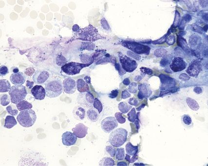 La cytologie permet d’évaluer la cellularité et les éventuelles dysplasies. En outre, il est important de quantifier les mastocytes, car un nombre ≥20% en dehors des fragments est considéré comme un critère de leucémie à mastocytes (MCL). En outre, un FACS est effectué sur le prélèvement de ponction de la moelle osseuse. Les analyses génétiques comprennent la détermination par génétique moléculaire de la mutation KIT-p.D816V avec charge mutationnelle («variant allele frequency», VAF) et par cytogénétique conventionnelle. Il n’existe toutefois aucune aberration spécifique à la MS, d’autant plus que celle-ci est rare pour la BMM et l’IMS.