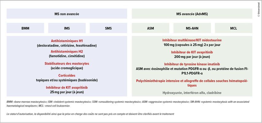 En cas d’allergie au venin d’hyménoptère, une immunothérapie spécifique doit être administrée en traitement continu à vie. En présence de symptômes modérés à sévères, pour lesquels ce traitement symptomatique ne permet pas un contrôle suffisant, le traitement de l’IMS peut utiliser l’avapritinib, un inhibiteur spécifique de KIT, à raison de 25mg par jour.7