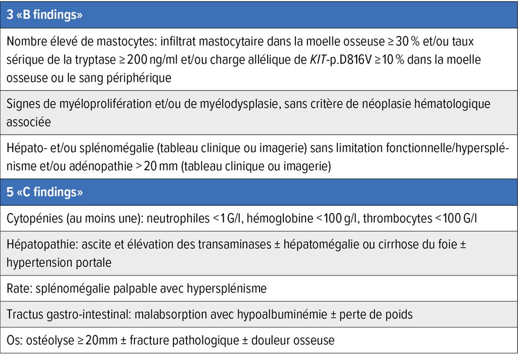 Si le diagnostic hématologique permet de poser le diagnostic de MS, il s’agit ensuite de déterminer le sous-type. Cela n’a pas seulement des conséquences pronostiques, mais aussi thérapeutiques. Pour déterminer le sous-type, il est important de vérifier la présence de «B findings» («burden of disease») ou de «C findings» («cytoreduction required»). Les «C findings» sont en fin de compte des limitations fonctionnelles des organes concernés dues à l’infiltrat mastocytaire. Les «B findings» et les «C findings» sont résumés dans le Tableau 2.