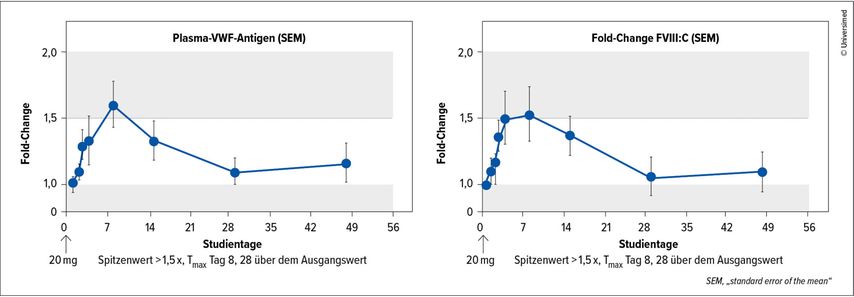 Unter der niedrigsten HMB-002-Dosis von 20mg erhöhten sich VWF und FVIII um das 1,5-Fache. Die Spitzenkonzentrationen im Plasma wurden jeweils am Tag 8 gemessen und die Werte blieben für 28 Tage nach Verabreichung über dem Ausgangswert (Abb.2). Die Thrombingenerierung erreichte einen Spitzenwert, der 65% von FVIII entsprach. Die VELORA-Pioneer-Studie setzt aufgrund der vielversprechenden Daten die Rekrutierung und Dosiseskalation fort und unterstützt die weitere Entwicklung von HMB-002 als prophylaktische Therapie für VWD.