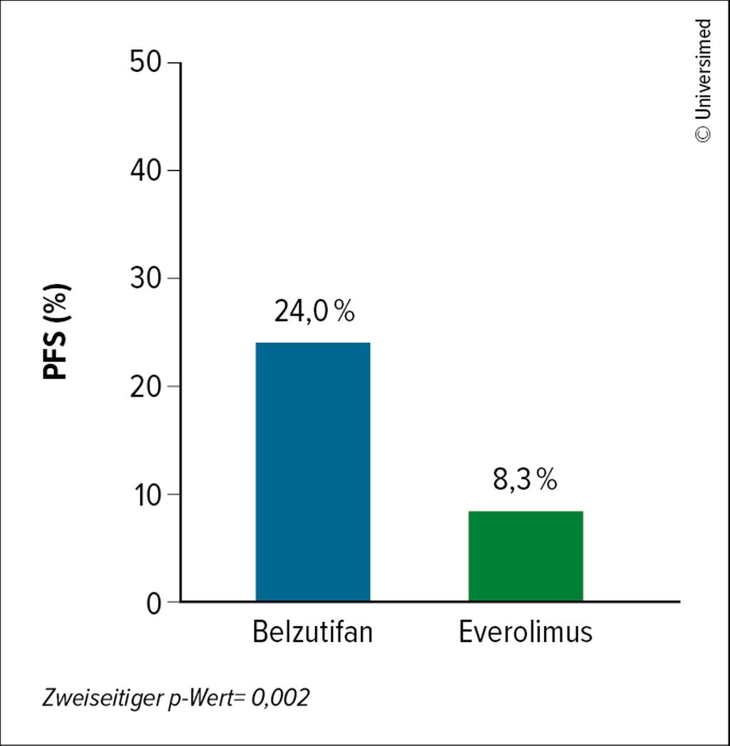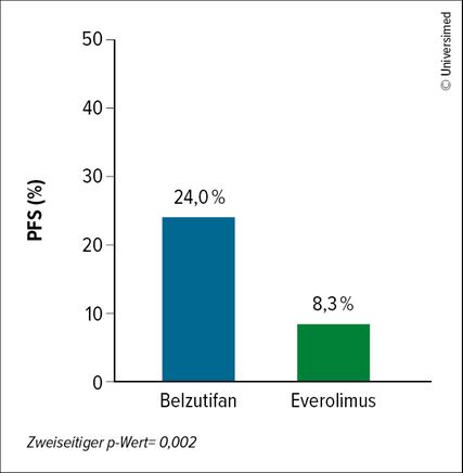 Um die Situation zu verbessern, sollten Substanzen mit einem neuen Wirkmechanismus untersucht werden. Eine vielversprechende Substanz ist der oral verfügbare HIF-2α-I Belzutifan, der zudem auch ein gutes Sicherheitsprofil aufweist: In der offenen Phase-III-Studie LITESPARK-005 wurde Belzutifan mit EVE an 374 ccRCC-Patient:innen mit vorangegangener IO und antiangiogenetischer Therapie verglichen. Der koprimäre Endpunkt setzte sich aus PFS und OS zusammen. In der ersten Interimsanalyse waren nach 18 Monaten unter Belzutifan vs. EVE 24,0 vs. 8,3% der Patient:innen progressionsfrei und am Leben. Damit war Belzutifan der Vergleichssubstanz signifikant überlegen (p=0,002; Abb. 1). Das OS war in der zweiten Interimsanalyse (medianes Follow-up: 25,7 Monate) mit 21,4 vs. 18,1 Monate in nicht signifikantem Ausmaß unter Belzutifan länger (p=0,2). Die finalen Ergebnisse sind noch ausständig.18