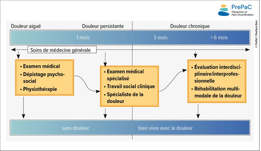 La physiothérapie, l’évaluation des facteurs de risque psychosociaux et l’intégration du travail social clinique dans un traitement multimodal de la douleur sont des éléments clés de la prévention et du traitement des douleurs chroniques.
