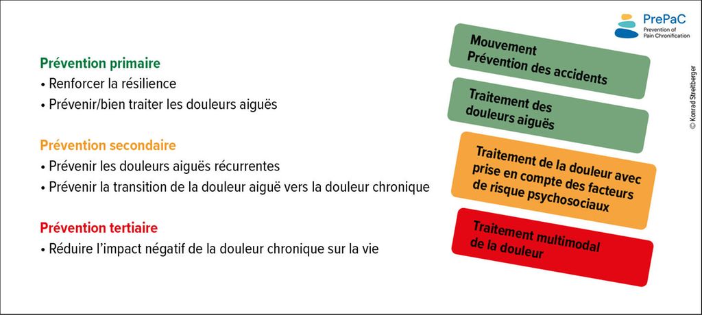 1 Cohen SP et al.: Chronic pain: an update on burden, best practices, and new advances. Lancet 2021; 397: 2082-97 2 Breivik H et al.: Survey of chronic pain in Europe: prevalence, impact on daily life, and treatment. Eur J Pain 2006; 10: 287-333 3 Wieser S et al.: Cost of low back pain in Switzerland in 2005. Eur J Health Econ 2011: 12: 455-67 4 European Pain Federation EFIC and Pain Alliance Europe (PAE): SIP position paper on preventive healthcare for chronic pain. 2025. https://europeanpainfederation.eu/wp-content/uploads/2025/07/SIP-Position-Paper-on-Preventive-Healthcare-for-Chronic-Pain-2025.pdf ; dernier accès le 28.8.2025 5 Treede RD et al.: Chronic pain as a symptom or a disease: the IASP Classification of Chronic Pain for the International Classification of Diseases (ICD-11). Pain 2019; 160: 19 6 Nicholas MK: The biopsychosocial model of pain 40 years on: time for a reappraisal? Pain 2022; 163: 3 7 Andrejeva N et al.: Psychosoziale Faktoren in der Prävention von Schmerz. Schmerz 2021; 35: 21-9 8 Kaiser U et al.: Vermeidung chronischer Schmerzen in der deutschen Gesundheitsversorgung. Schmerz 2021; 35: 45-52 9 Fitzcharles MA et al.: Nociplastic pain: towards an understanding of prevalent pain conditions. Lancet 2021; 397: 2098-110 10 International Association for the Study of Pain (IASP): Preventing pain: an introduction. https://www.iasp-pain.org/resources/fact-sheets/preventing-pain-an-introduction/ ; dernier accès le 27.8.2025 11 International Association for the Study of Pain (IASP): Prévenir la douleur: une introduc1on. https://iaspfiles.s3.amazonaws.com/production/public/1_French%20Global%20Year%202020%20Prevention%20Introduction.pdf ; dernier accès le 18.9.2025 12 Fisher E, Eccleston C: Psychologische Aspekte der Schmerzprävention. Schmerz 2023; 37: 47-54 13 Ernstzen DV et al.: Synthesis of clinical practice guideline recommendations for the pri-mary health care of chronic musculoskeletal pain. J Eval Clin Pract 2022; 28: 454-67 14 Manigold T et al.: Multiprofessioneller Behandlungsansatz bei chronischen Rückenschmerzen. Z Rheumatol 2022; 82: 31-7 15 Promotion Santé Suisse: Prévention dans le domaine des soins. https://promotionsante.ch/prevention-dans-le-domaine-des-soins/soutien-de-projets/bases/pds ;dernier accès le 27.8.2025 16 Giani A et al.: Guidelines für Grundversorgende: Lumbale Rücken-schmerzen. Prim Hosp Care 2020; https://doi.emh.ch/phc-d.2020.10152 ; dernier accès le 27.8.2025 17Salduker S et al.: Practical approach to a patient with chronic pain of uncertain etiology in primary care. J Pain Res 2019; 12: 2651-62 18 Poß-Doering R et al.: Hausärztliche Versorgung von Patient:innen mit chronischen nicht-tumorbedingten Schmerzen: ein Rapid Review im Rahmen des RELIEF-Projekts. Z Evid Fortbild Qual Gesundheitswes 2024; 185: 1-9