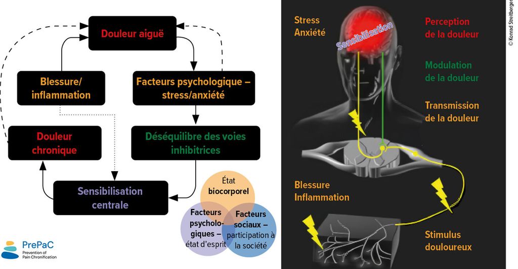 Les douleurs aiguës jouent un rôle essentiel dans la survie et constituent l’un des motifs les plus fréquents de consultation médicale. Toutefois, lorsqu’elles persistent, des modifications surviennent dans le système nerveux central dès trois mois, ouvrant la voie à des douleurs chroniques. La compréhension du modèle biopsychosocial fournit les bases pour explorer de nouvelles approches en matière de prévention, tant à l’échelle individuelle que sociétale.