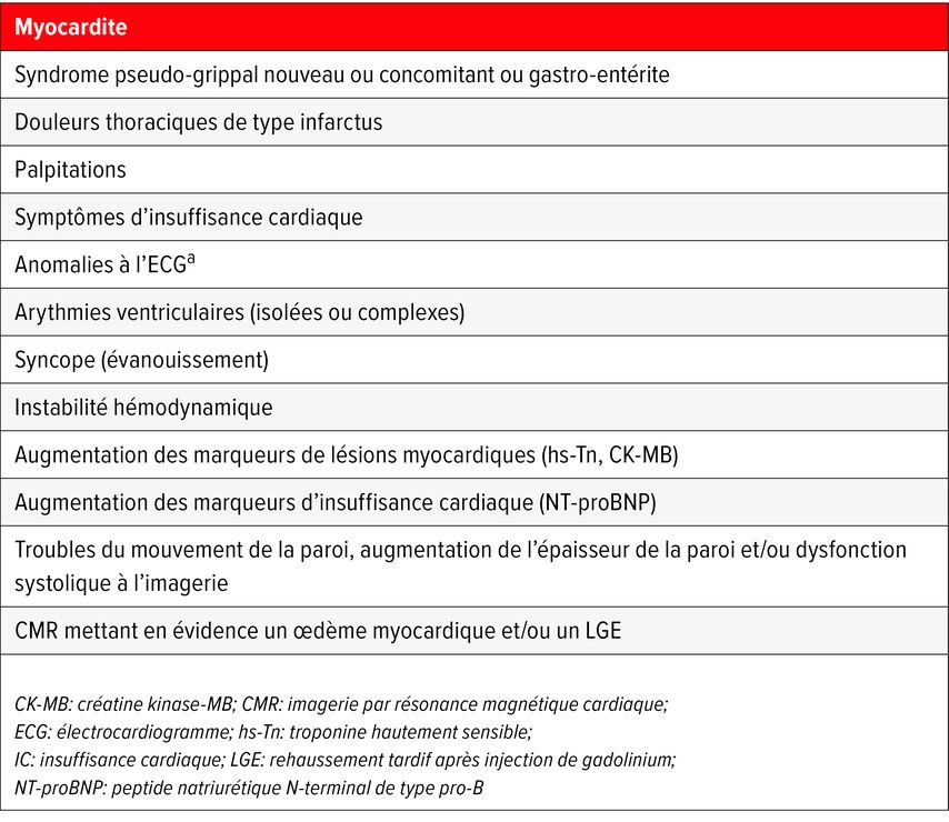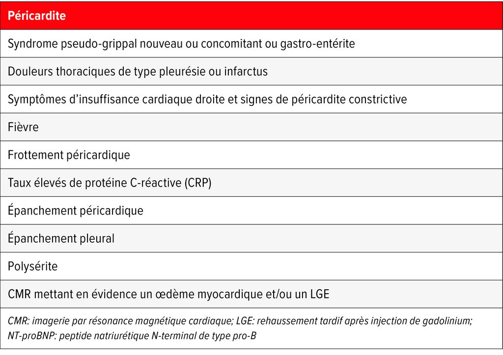 Quels sont les signes ou symptômes qui indiquent une myocardite ou un «inflammatory myopericardial syndrome» (IMPS) (Tab.1 et 2)? Comment gérer les symptômes d’insuffisance cardiaque ou les arythmies? Les directives proposent également des diagrammes de flux et des algorithmes complets pour ces questions.