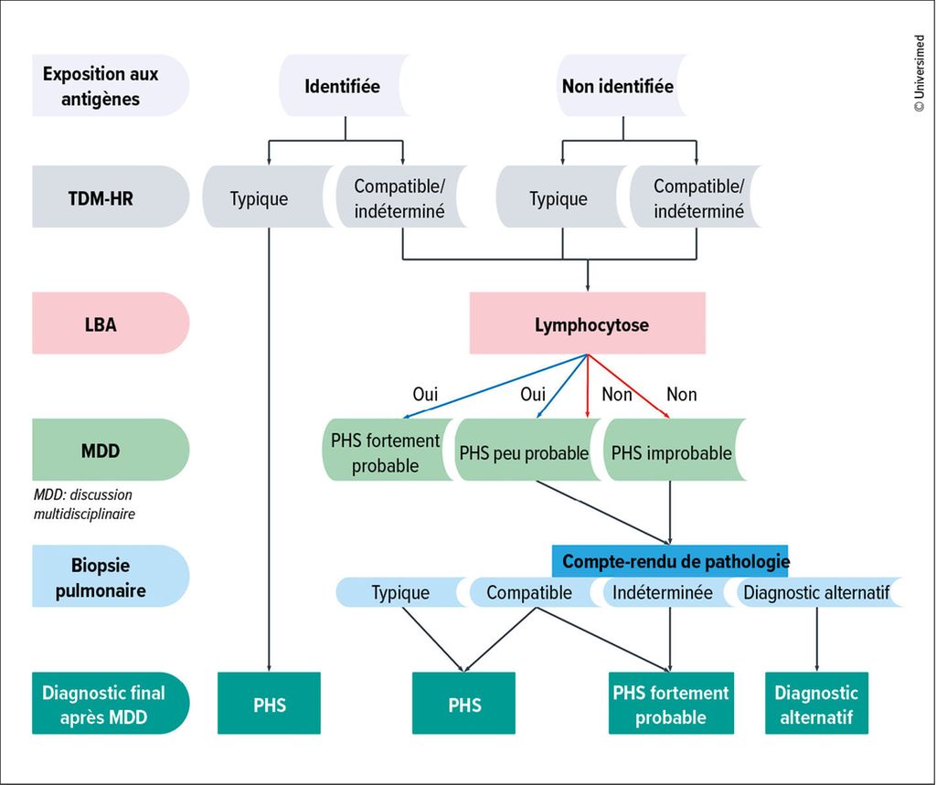 Le diagnostic de la PHS nécessite une discussion multidisciplinaire incluant des corrélations cliniques, radiologiques et pathologiques (Fig.1). Un diagnostic peut souvent être posé sans biopsie en présence d’une anamnèse claire de l’exposition à un antigène connu et de résultats typiques de TDM-HR. Si l’anamnèse de l’exposition n’est pas claire ou les caractéristiques d’imagerie sont atypiques, une biopsie pulmonaire peut toutefois être nécessaire (Fig.1). L’interprétation des résultats de biopsie nécessite une corrélation minutieuse avec l’imagerie. Certain·es patient·es dont les images de TDM évoquent une PHS fibrotique peuvent présenter un motif de PINS ou d’UIP à la biopsie, tandis que d’autres avec des images de TDM compatibles avec un motif de PINS ou d’UIP peuvent présenter les caractéristiques histologiques d’une PHS. L’absence d’antigène connu est associée à un pronostic plus défavorable, ce qui souligne la nécessité d’une approche diagnostique globale prenant en compte toutes les informations cliniques, d’imagerie et histopathologiques disponibles.