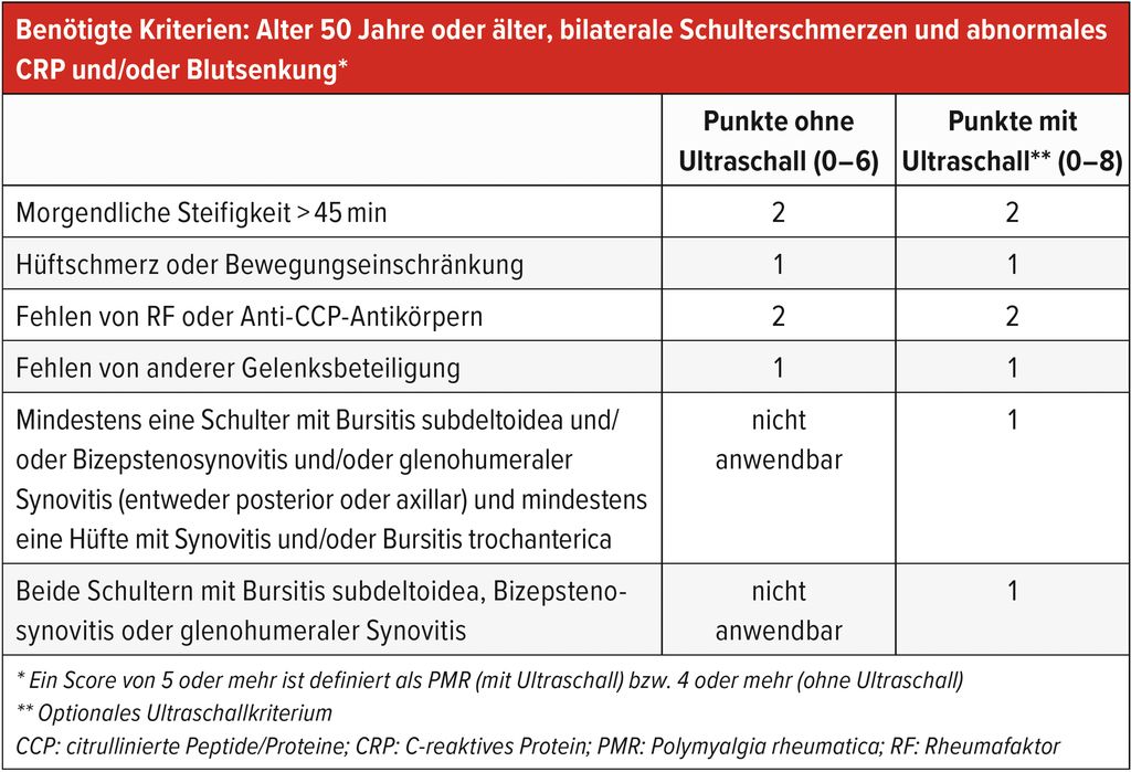 Die EULAR (European Alliance of Associations for Rheumatology) hat 2012 Klassifikationskriterien erstellt,3 welche diese Schlüsselmerkmale beinhalten (Tab.1). Nebst diesen Schlüsselmerkmalen werden auch Punkte für eine Negativität von Rheumafaktor und Anti-CCP-Antikörpern sowie für das Fehlen anderer Gelenkschmerzen vergeben. Zu beachten ist aber, dass es sich hierbei um Klassifikationskriterien handelt, die in der Regel für Studien zum Einschluss von Probanden verwendet werden. Es sind keine Diagnosekriterien, mit denen man im Sinne einer Checkliste bei Erfüllen der Kriterien die Diagnose stellen kann. Und so ist denn auch die Sensitivität mit 68% und Spezifität mit 78% eher niedrig. Mit Hinzunahme der Ultraschalldiagnostik von Schultern und Hüften können die Sensitivität mit 66% und die Spezifität mit 81% nur wenig beeinflusst werden. Typische Zeichen für eine PMR im Ultraschall sind eine in der Regel beidseitige Bursitis subdeltoidea, ein Erguss um die Bizepssehne bei glenohumeraler Synovitis sowie eine Bursitis trochanterica oder Synovitis femoroazetabulär am Hüftgelenk.